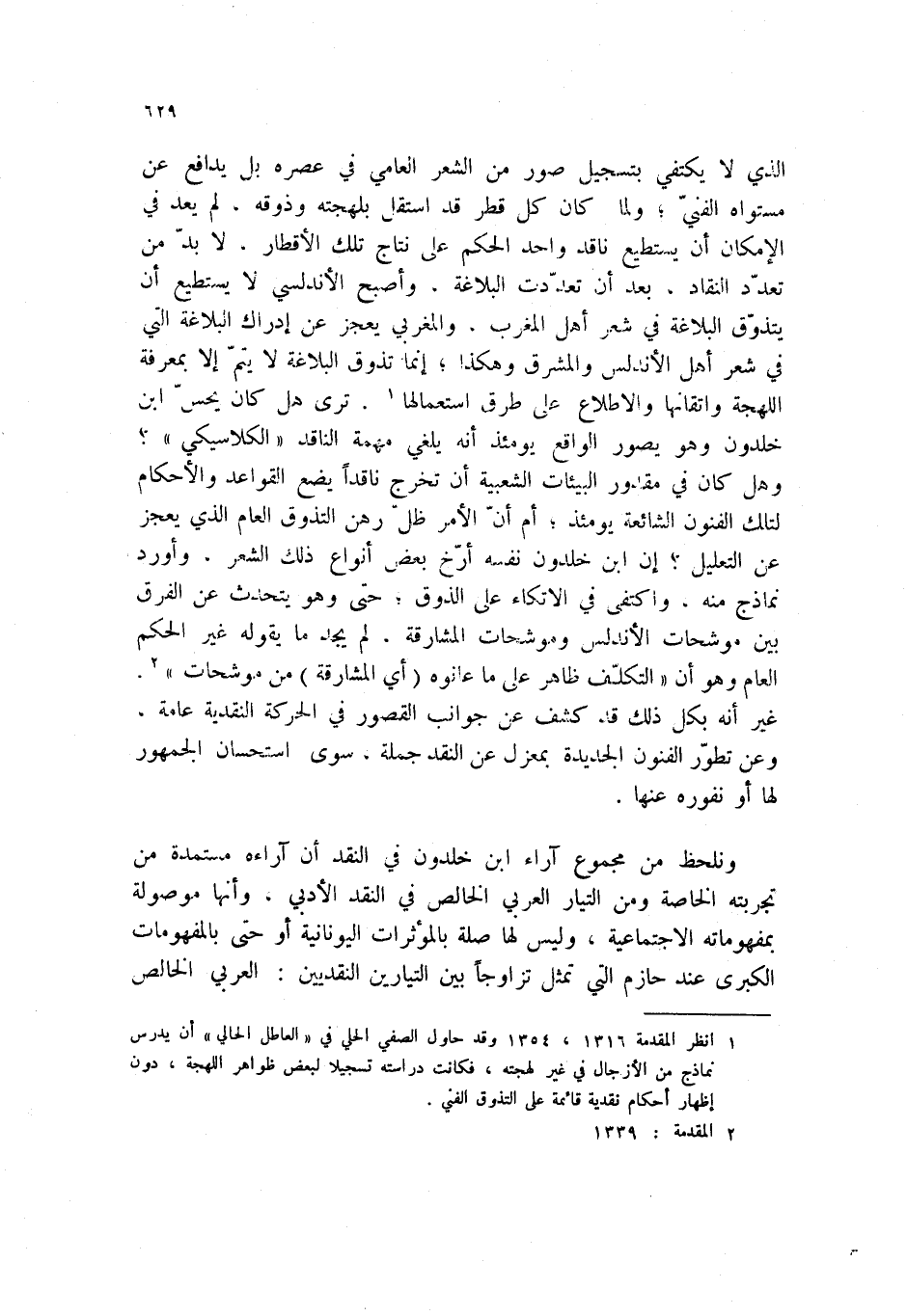 (1) انظر المقدمة 1316، 1354 وقد حاول الصفي الحلي في " العاطل الحالي " أن يدرس نماذج من الأزجال في غير لهجته، فكانت دراسته تسجيلاً لبعض ظواهر اللهجة، دون إظهار أحكام نقدية قائمة على التذوق الفني.