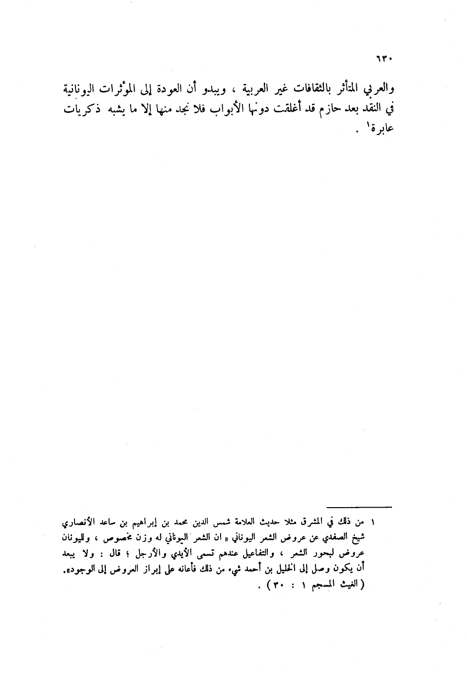 (1) من ذلك في المشرق مثلا حديث العلامة شمس الدين محمد بن إبراهيم بن ساعد الأنصاري شيخ الصفدي عن عروض الشعر اليوناني " أن الشعر اليوناني له وزن مخصوص، واليونان عروض لبحور الشعر، والتفاعيل عندهم تسمى الأيدي والأرجل؛ قال: ولا يبعد أن يكون وصل إلى الخليل بن أحمد شيء من ذلك فأعانه على إبراز العروض إلى الوجود ". (الغيث المسجم 1: 30) .