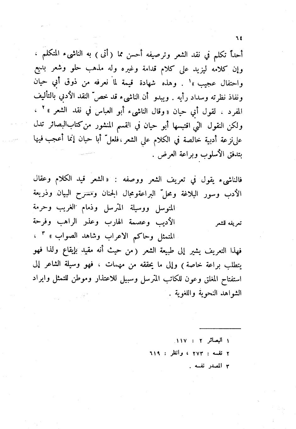 أحداً تكلم في نقد الشعر وترصيفه أحسن مما (أتى) به الناشئ المتكلم، وان كلامه ليزيد على كلام قدامة وغيره وله مذهب حلو وشعر بديع واحتفال عجيب " (1) . وهذه شهادة قيمة لما نعرفه من ذوق أبي حيان ونفاذ نظراته وسداد رأيه. ويبدو أن الناشئ قد خص النقد الأدبي بالتأليف المفرد. لقول أبي حيان " وقال الناشئ أبو العباس في نقد الشعر " (2) . ولكن النقول التي اقتبها أبو حيان في القسم المنشور من كتاب البصائر تدل على نزعة أدبية خالصة في الكلام على الشعر، فلعل أبا حيان إنما اعجب فيها بتدفق الأسلوب وبراعة العرض.