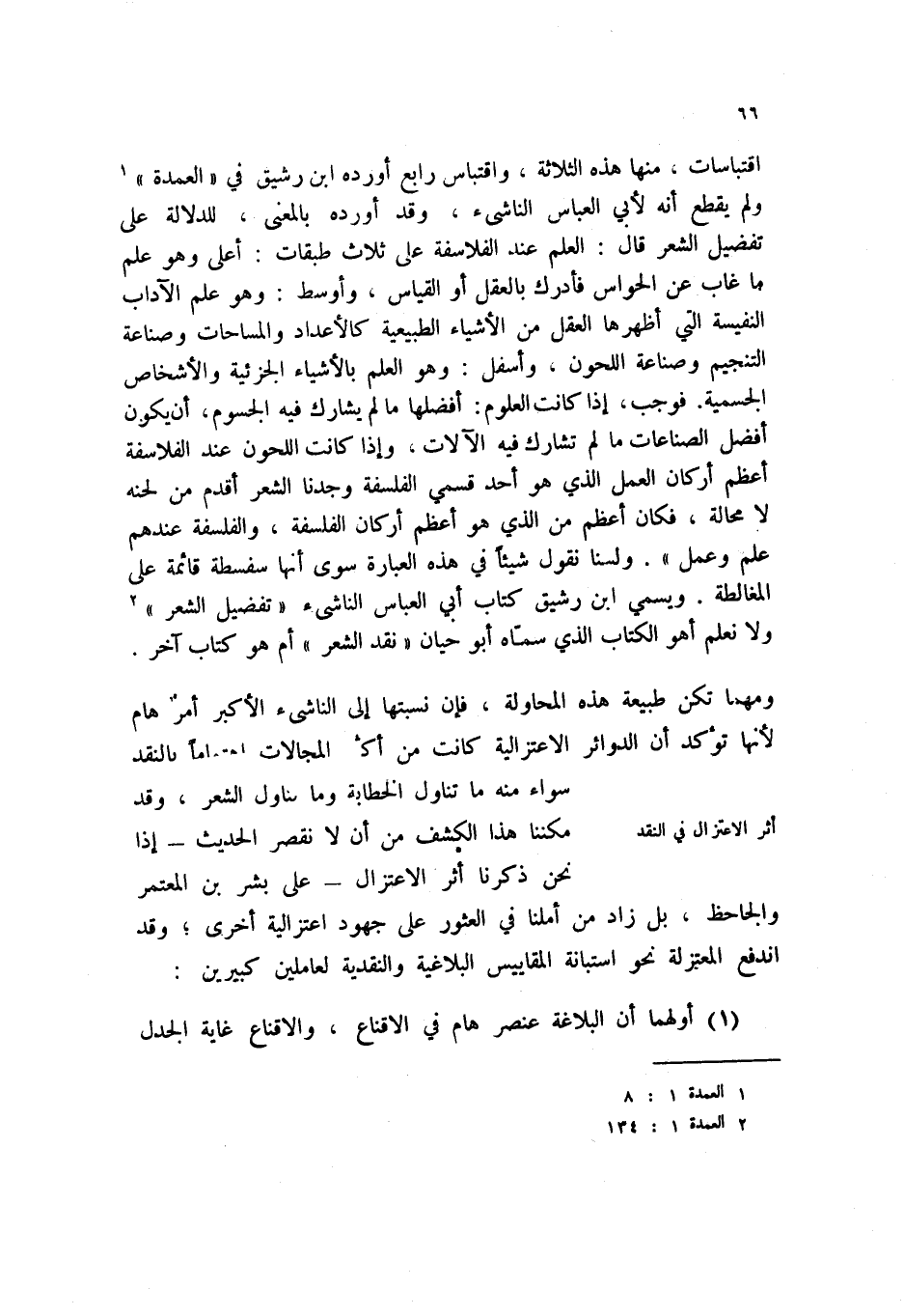 اقتباسات، منها هذه الثلاثة، واقتباس رابع أورده ابن رشيق في " العمدة " (1) ، ولم يقطع انه لأبي العباس الناشئ، وقد أورده بالمعنى، للدلالة على تفضيل الشعر قال: العلم عند الفلاسفة على ثلاثة طبقات: أعلى وهو علم ما غاب عن الحواس فأدرك بالعقل أو القياس، وأوسط: وهو علم الآداب النفسية التي أظهرها العقل من الأشياء الطبيعية كالأعداد والمساحات وصناعة التنجيم وصناعة اللحون، وأسفل: وهو العلم بالأشياء الجزئية والأشخاص الجسمية فوجب، إذا كانت العلوم: أفضلها ما لم يشارك فيه الجسوم، ان يكون افضل الصناعات ما لم تشارك فيه الآلات، وإذا كانت اللحون عند الفلاسفة أعظم أركان العمل الذي هو أحد اسمي الفلسفة وجدنا الشعر اقدم من لحنه لا محالة، فكان اعظم من الذي هو اعظم أركان الفلسفة، والفلسفة عندهم علم وعمل ". ولسنا نقول شيئاً في هذه العبارة سوى إنها سفسطة قائمة على المغالطة. ويسمي ابن رشيق كتاب أبي العباس الناشئ " تفضيل الشعر " (2) ، ولا نعلم أهو الكتاب الذي سماه أبو حيان " نقد الشعر " أم هو كتاب آخر.
