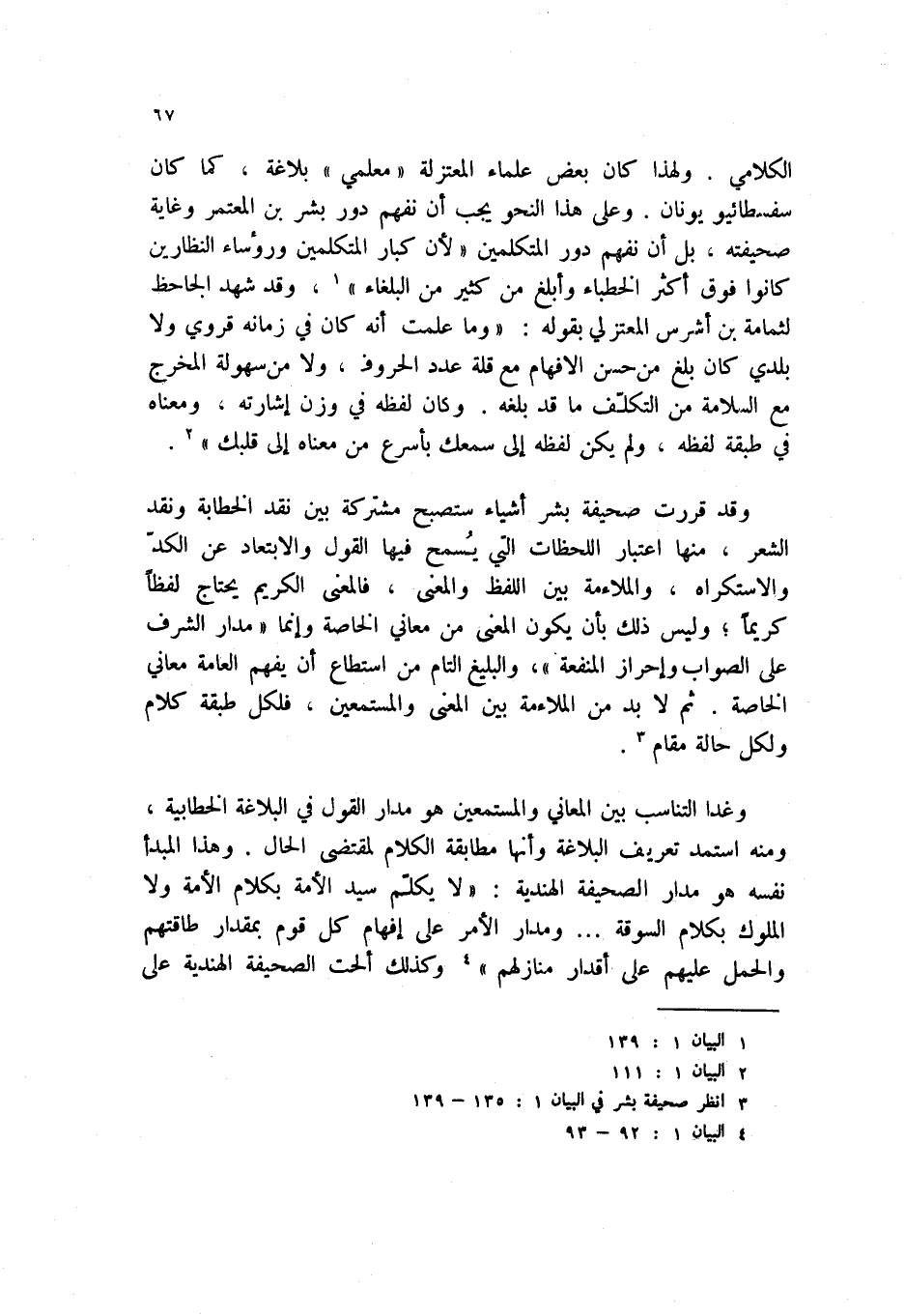 الكلامي، ولهذا كان بعض علماء المعتزلة " معلمي " بلاغة، كما كان سفسطائي يونان، وعلى هذا النحو يجب ان نفهم دور بشر بن المعتمر وغاية صحيفته، بل أن نفهم دور المتكلمين " لان كبار المتكلمين ورؤساء النظارين كانوا فوق أكثر الخطباء وابلغ من كثير من البلغاء " (1) وقد شهد الجاحظ لثمامة بن أشرس المعتزلي بقوله: " وما علمت أنه كان في زمانه قروي ولا بلدي كان بلغ من حسن الإفهام مع قلة عدد الحروف، ولا من سهولة المخرج مع السلامة من التكلف ما قد بلغه. وكان لفظه في وزن إشارته، ومعناه في طبقة لفظه، ولم يكن لفظه إلى سمعك بأسرع من معناه إلى قلبك " (2) .