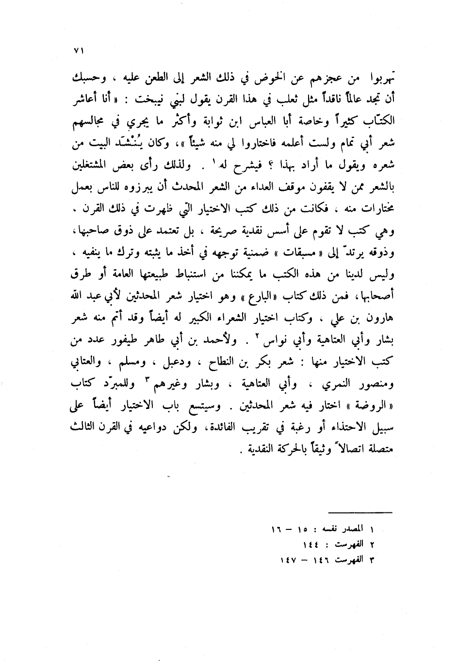 تهربوا من عجزهم عن الخوض في ذلك الشعر إلى الطعن عليه، وحسبك أن تجد عالماً ناقداً مثل ثعلب في هذا القرن يقول لبني نيبخت: " أنا أعاشر الكتاب كثيراً وخاصة أبا العباس ابن ثوابة واكثر ما يجري في مجالسهم شعر أبي تمام ولست أعلمه فاختاروا لي منه شيئاً "، وكان ينشد البيت من شعره ويقول ما أراد بهذا؟ فيشرح له (1) . ولذلك رأى بعض المشتغلين بالشعر ممن لا يقفون موقف العداء من الشعر المحدث أن يبرزوه للناس بعمل مختارات منه، فكانت من ذلك كتب الاختيار التي ظهرت في ذلك القرن، وهي كتب لا تقوم على أسس نقدية صريحة، بل تعتمد على ذوق صاحبها، وذوقه يرتد إلى " مسبقات " ضمنية توجهه في أخذ ما يثبته وترك ما ينفيه، وليس لدينا من هذه الكتب ما يمكننا من استنباط طبيعتها العامة او طرق أصحابها، فمن ذلك كتاب " البارع " وهو اختيار شعر المحدثين لأبي عبد الله هارون بن علي. وكتاب اختيار الشعراء الكبير له أيضاً وقد أتم منه شعر بشار وأبي العتاهية وأبي نواس (2) . ولأحمد بن أبي طاهر طيفور عدد من كتب الاختيار منها: شعر بكر بن النطاح، ودعبل، ومسلم، والعتابي، ومنصور النمري، وأبي العتاهية، وبشار وغيرهم (3) وللمبرد كتاب " الروضة " أختار فيه شعر المحدثين. وسيتسع باب الاختيار أيضاً على سبيل الاحتذاء أو رغبة في تقريب الفائدة، ولكن دواعيه في القرن الثالث متصلة اتصالا وثيقاً بالحركة النقدية.