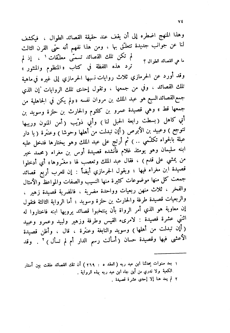 وهذا المنهج اضطره إلى أن يقف عند حقيقة القصائد الطوال، فيكشف لنا عن جوانب جديدة تتعلق بها، ومن هذا نفهم انه حتى القرن الثالث لم تكن تلك القصائد تسمى معلقات (1) ، إذ لم ترد هذه اللفظة في كتاب " المنظوم والمنثور " وقد أورد عن الحرمازي ثلاث روايات نسبها الحرمازي إلى غيره في ماهية تلك القصائد، وفي من جمعها، وتقول إحدى تلك الروايات إن الذي جمع القصائد السبع هو عبد الملك بن مروان نفسه " ولم يكن في الجاهلية من جمعها قط " وهي قصيدة عمرو بن كلثوم والحارث بن حلزة وسويد بن أبي كاهل (بسطت رابعة الحبل لنا) وأبي ذؤيب (أمن المنون وريبها تتوجع) وعبيد بن الأبرص (أن تبدلت من أهلها وحوشا) وعنترة (يا دار عبلة بالجواء تكلمي..) ثم أرتج على عبد الملك وهو يختارها فدخل عليه ابنه سليمان وهو يومئذ غلام فانشده قصيدة أوس بن مغراء (محمد خير من يمشي على قدم) ، فقال عبد الملك وتعصب لها " مغروها " أي أدخلوا قصيدة ابن مغراء فيها؛ ويقول الحرمازي أيضاً: إن للعرب أربع قصائد جمعت كل منها موضوعات كثيرة منها النسيب والصفات والمواعظ والأمثال والفخر، ثلاث منهن ربعيات وواحدة مضرية، فالمضرية قصيدة زهير، والربعيات قصيدة طرفة والحارث بن حلزة وسويد؛ أما الرواية الثالثة فتقول إن معاوية هو الذي أمر الرواة بأن ينتخبوا قصائد يرويها ابنه فاختاروا له اثنتي عشرة قصيدة: لامرئ القيس وطرفة وزهير ولبيد وعمرو وعبيد (إن تبدلت من أهلها) وسويد والنابغة وعنترة، قال، وأظن قصيدة الأعشى فيها وقصيدة حسان (أسالت رسم الدار أم لم تسأل) (2) . وقد