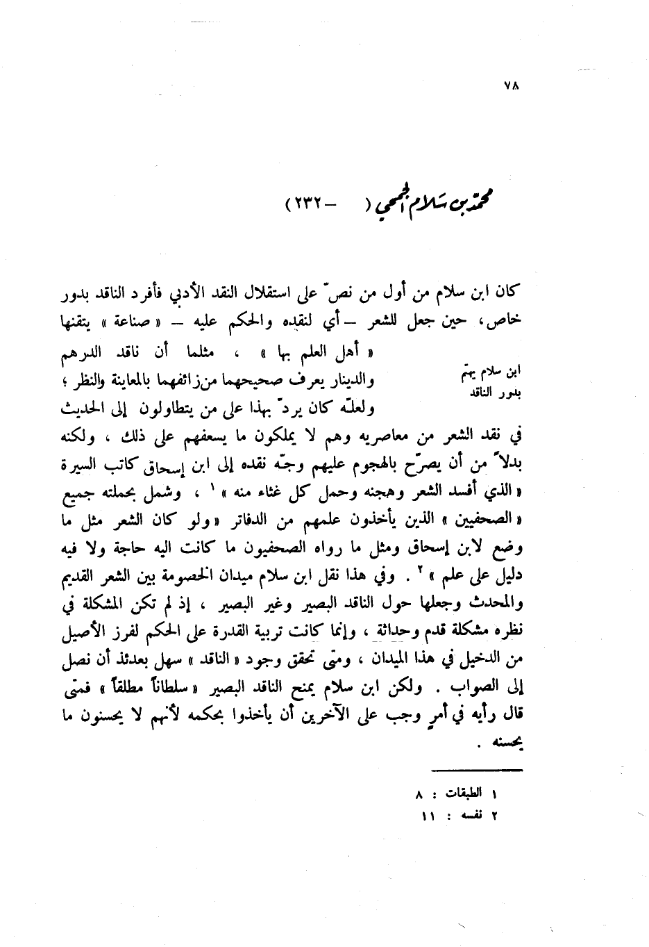 كان ابن سلام من أول من نص على استقلال النقد الأدبي فأفرد الناقد بدور خاص، حين جعل للشعر - أي بنقده والحكم عليه - " صناعة " يتقنها " أهل العلم بها "، مثلما أن ناقد الدرهم والدينار يعرف صحيحهما من زائفهما بالمعاينة والنظر؛ ولعله كان يرد بهذا على من يتطاولون إلى الحديث في نقد الشعر من معاصريه وهم لا يملكون ما يسعفهم على ذلك، ولكنه بدلا من أن يصرح بالهجوم عليه وجه نقده إلى ابن إسحاق كاتب السيرة " الذي افسد الشعر وهجنه وحمل كل غثاء منه " (1) ، وشمل بحملته جميع " الصحفيين " الذين يأخذون علمهم من الدفاتر " ولو كان الشعر مثل ما وضع لابن إسحاق ومثل ما رواه الصحفييون ما كانت غليه حاجة ولا فيه دليل على علم " (2) . وفي هذا نقل ابن سلام ميدان الخصومة بين الشعر القديم والمحدث وجعلها حول الناقد البصير وغير البصير، إذ لم تكن المشكلة في نظره مشكلة قدم وحداثة، وإنما كانت تربية القدرة على الحكم لفرز الأصيل من الدخيل في هذا الميدان، ومتى تحقق وجود " الناقد " سهل بعدئذ أن نصل إلى الصواب. ولكن ابن سلام يمنح الناقد البصير " سلطاناً مطلقاً " فمتى قال رأيه في أمر وجد على الآخرين ان يأخذوا بحكمه لانه لا يحسنون ما يحسنه.