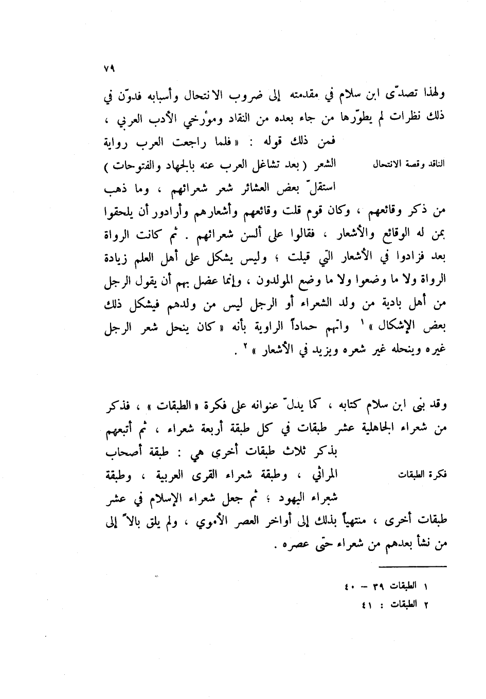ولهذا تصدى ابن سلام في مقدمته إلى ضروب الانتحال وأسبابه فدون في ذلك نظرات لم يطورها من جاء بعده من النقاد ومؤرخي الأدب العربي، فمن ذلك قوله: " فلما راجعت العرب رواية الشعر (بعد تشاغل العرب عنه بالجهاد والفتوحات) استقل بعض العشائر شعر شعرائهم، وما ذهب من ذكر وقائعهم، وكان قوم قلة وقائعهم وأشعارهم وأرادوا أن يلحقوا بمن له الوقائع والأشعار، فقالوا على السن شعائرهم. ثم كانت الرواة بعد فزادوا في الأشعار التي قيلت؛ وليس يشكل على أهل العلم زيادة الرواة ولا ما وضعوا ولا ما وضع المولودون، وإنما عضل بهم أن يقول الرجل من أهل بادية من ولد الشعراء أو الرجل ليس من ولدهم فيشكل ذلك بعض الأشكال " (1) واتهم حماداً الراوية بأنه " كان ينحل شعر الرجل غيره وينحله غير شعره ويزيد في الأشعار " (2) .