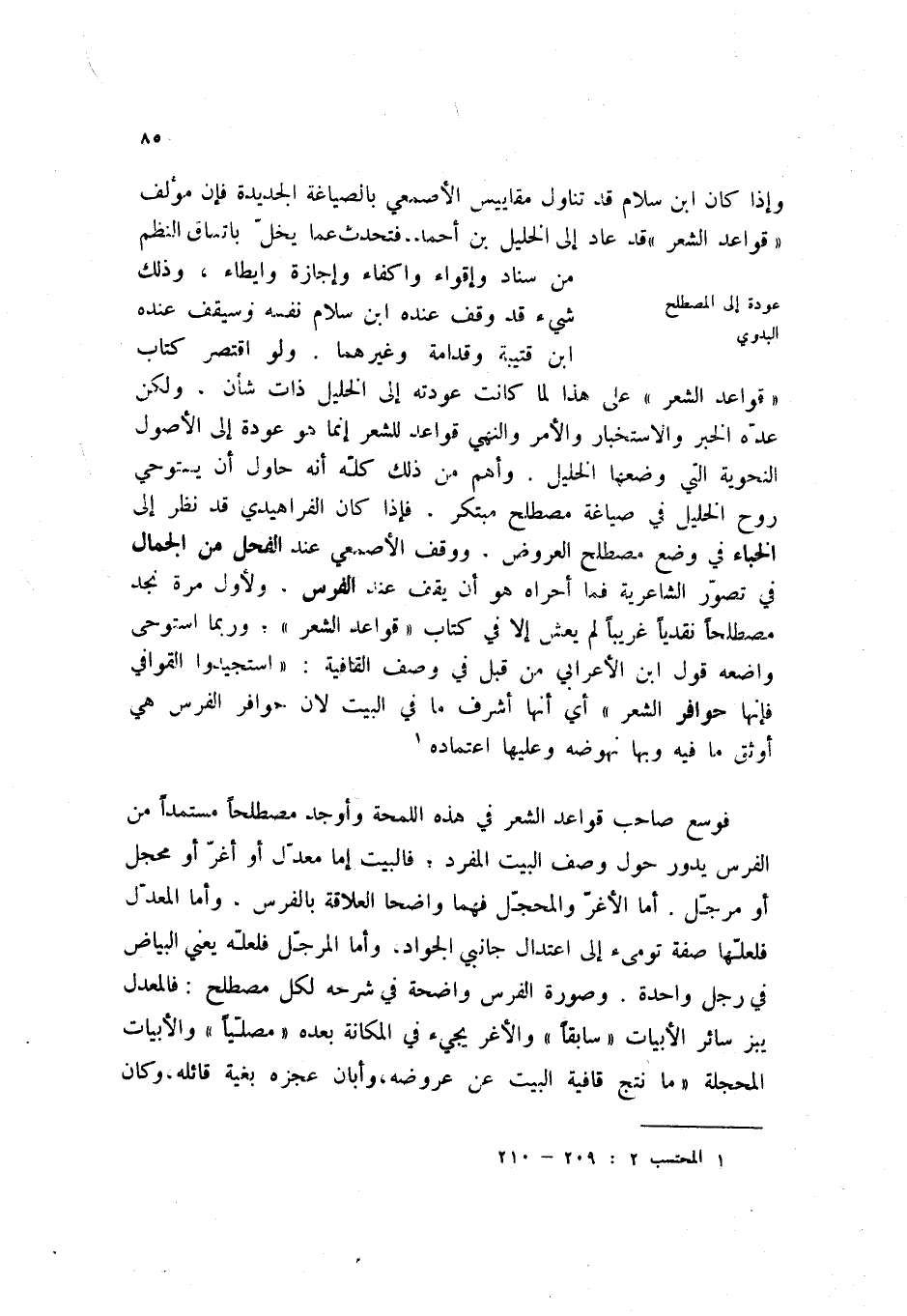 وإذا كان ابن سلام قد تناول مقاييس الأصمعي بالصياغة الجديدة فإن مؤلف " قواعد الشعر " قد عاد إلى الخليل بن أحمد، فتحدث عما يخل باتساق النظم من سناد وإقواء وأكفاء وإجازة وايطاء، وذلك شيء قد وقف عنده ابن سلام نفسه وسيقف عنده ابن قتيبة وقدامة وغيرهما. ولو اقتصر كتاب " قواعد الشعر " على هذا لما كانت عودته إلى الخليل ذات شأن، ولكن عدة الخبر والاستخبار والأمر والنهي قواعد للشعر إنما هو عودة إلى الأصول النحوية التي وضعها الخليل. واهم من ذلك كله أنه حاول أن يستوحي روح الخليل في صياغة مصطلح مبتكر، فإذا كان الفراهيدي قد نظر إلى الخباء في وضع مصطلح العروض، ووقف الأصمعي عند الفحل من الجمال في تصور الشاعرية فما أجراه هو أن يقف عند الفرس، ولاول مرة نجد مصطلحاً نقدياً غريباً لم يعش إلا في كتاب " قواعد الشعر "؛ وربما استوحى واضعه قول ابن الأعرابي من قبل في وصف القافية: " استجيدوا القوافي فأنها حوافز الشعر " أي أنها أشرف ما في البيت لان حوافز الفرس هي أوثق ما فيه وبها نهوضه وعليها اعتماده (1) .