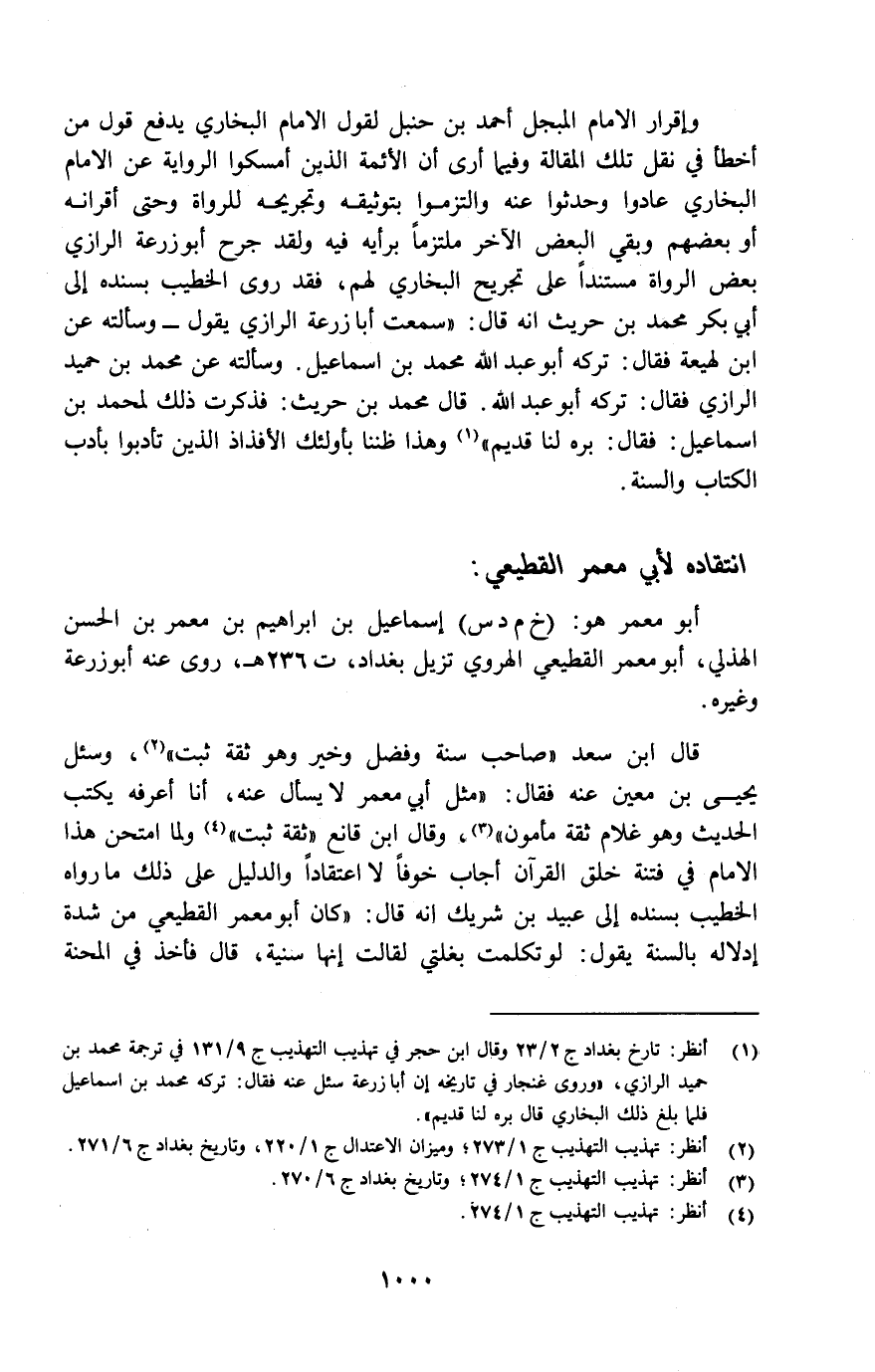 (¬1) انظر: تاريخ بغداد ج2/23 وقال ابن حجر في تهذيب التهذيب ج9/131 في ترجمة محمد بن حميد الرازي، "وروى غنجار في تاريخه إن أبا زرعة سئل عنه فقال: تركه محمد بن إسماعيل فلما بلغ ذلك البخاري قال بره لنا قديم".