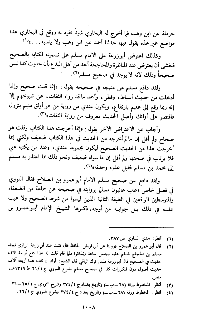 (¬2) قال أبو عمرو بن الصلاح "روينا عن أبي قريش الحافظ قال كنت عند أبي زرعة الرازي فجاء مسلم بن الحجاج فسلم عليه وجلس ساعة وتذاكرا فلما قام قلت له هذا جمع أربعة آلاف حديث في الصحيح قال أبو زرعة: "فلمن ترك الباقي؟ قال الشيخ: "أراد ان كتابه هذا أربعة آلاف حديث أصول دون المكررات" كذا في صحيح مسلم بشرح النووي ج1/21ط 1349 هـ، مصر.