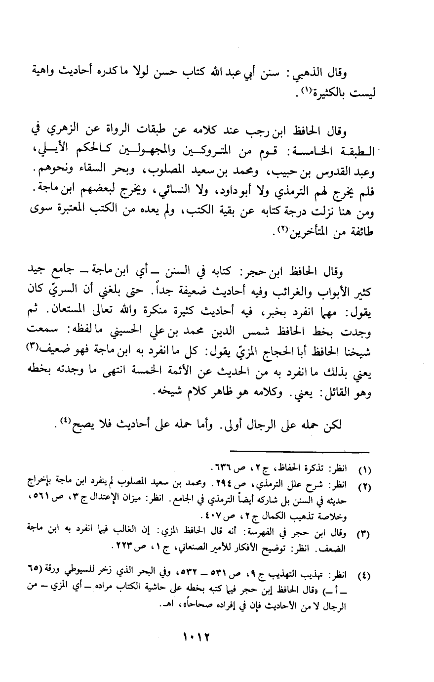 (¬3) وقال ابن حجر في الفهرسة: أنه قال الحافظ المزي: "إن الغالب فيما انفرد به ابن ماجة الضعف". انظر: توضيح الأفكار للأمير الصنعاني ج1 ص 223.