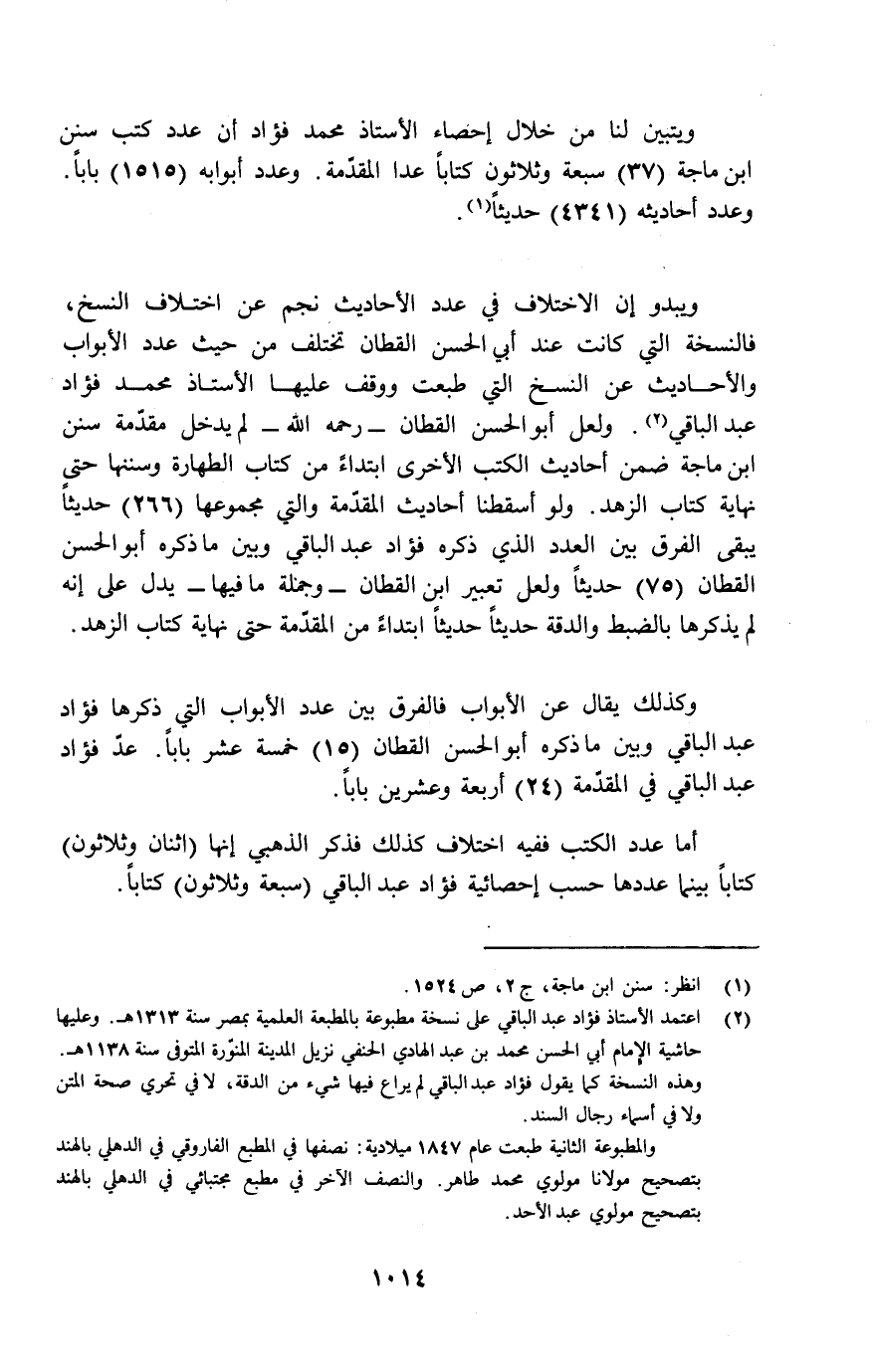 (¬2) اعتمد الأستاذ فؤاد عبد الباقي على نسخة مطبوعة بالمطبعة العلمية بمصر سنة 1313 هـ. وعليها حاشية الإمام أبي الحسن محمد بن عبد الهادي الحنفي نزيل المدينة المنورة المتوفى سنة 1138هـ. وهذه النسخة كما يقول فؤاد عبد الباقي لم يراع فيها شيء من الدقة، لا في تحري صحة المتن ولا في أسماء رجال السند.