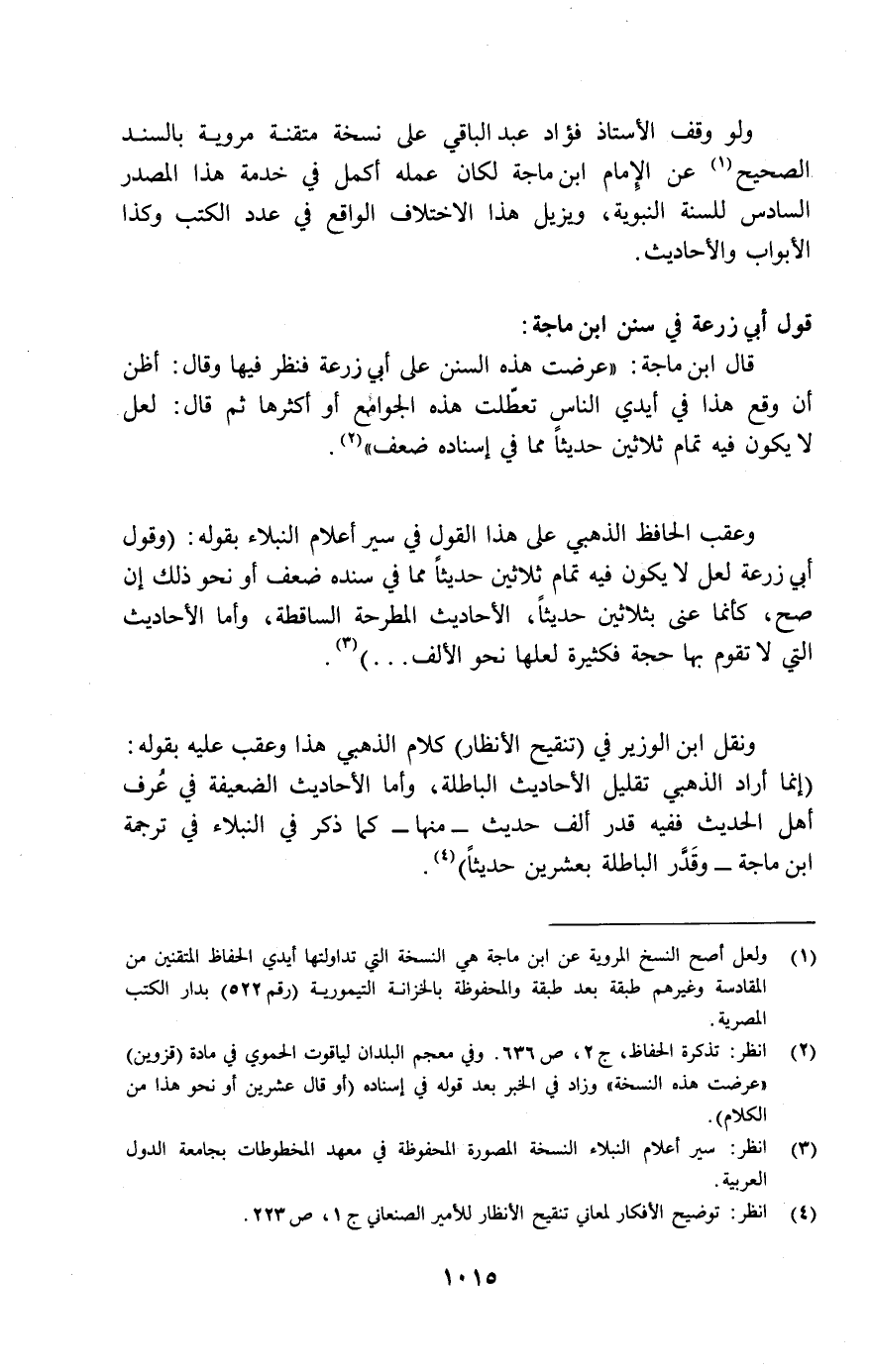 ونقل ابن الوزير في (تنقيح الأنظار) كلام الذهبي هذا وعقب عليه بقوله: "إنما أراد الذهبي تقليل الأحاديث الباطلة، وأما الأحاديث الضعيفة في عرف أهل الحديث ففيه قدر ألف حديث- منها- كما ذكر في النبلاء في ترجمة ابن ماجة- وقدَّر الباطلة بعشرين حديثاً" (¬4) .