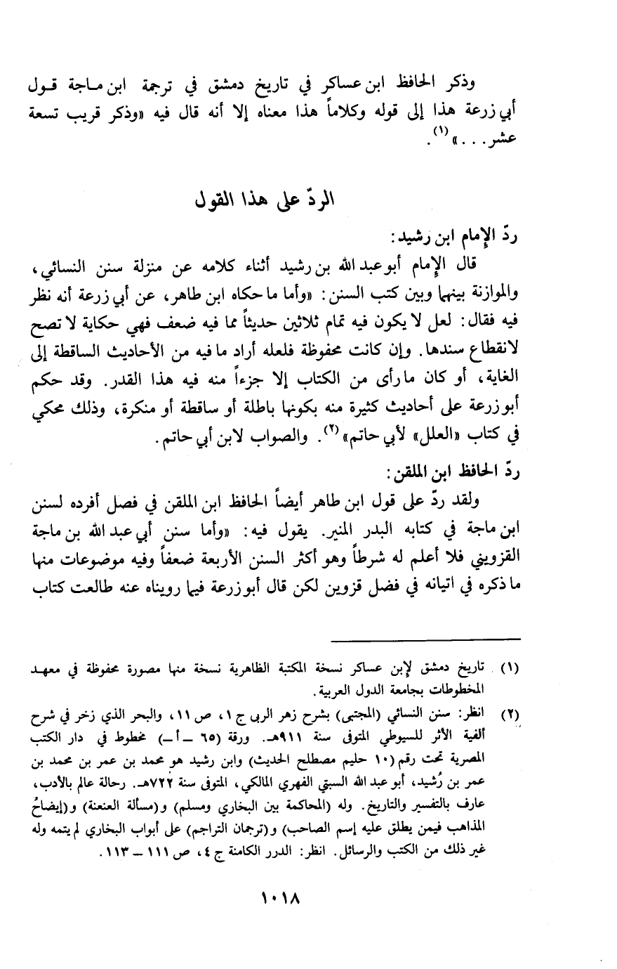 (¬2) انظر: سنن النسائي (المجتبى) بشرح زهر الربى ج1 ص 11، والبحر الذي زخر في شرح ألفية الأثر للسيوطي المتوفى سنة 911 هـ. ورقة (65- أ-) مخطوط في دار الكتب المصرية تحت رقم (10 حليم مصطلح الحديث) وابن رشيد هو محمد ابن عمر بن محمد بن عمر بن رشيد، أبو عبد الله السبتي الفهري المالكي، المتوفى سنة 722 هـ. رحالة عالم بالأدب، عارف بالتفسير والتاريخ. وله (المحاكمة بين البخاري ومسلم) و (مسألة العنعنة) و (إيضاخ المذاهب فيمن يطلق عليه إسم الصاحب) و (ترجمان التراجم) على أبواب البخاري لم يتمه وله غير ذلك من الكتب والرسائل. انظر: الدرر الكامنة ج 4 ص 111- 113.