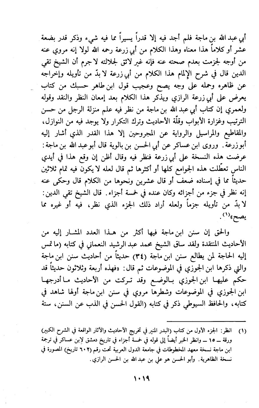 (¬1) انظر: الجزء الأول من كتاب (البدر المنير في تخريج الأحاديث والآثار الواقعة في الشرح الكبير ورقة- 15- وانظر الخبر أيضاً إلى قوله في خمسة أجزاء في تاريخ دمشق لابن عساكر في ترجمة ابن ماجة نسخة معهد المخطوطات في جامعة الدول العربية تحت رقم (602 تاريخ) المصورة في نسخة الظاهرية. وأبو الحسن هو علي بن عبد الله بن الحسن الرازي.