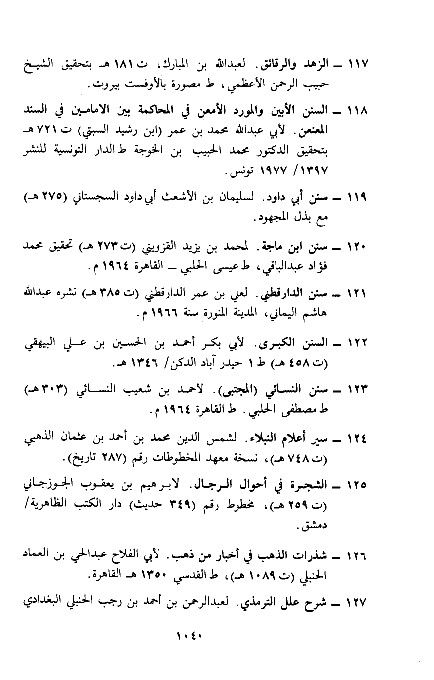 118- السنن الأبين والمورد الأمعن في المحاكمة بين الإمامين في السند المعنعن. لأبي عبد الله محمد بن عمر (ابن رشيد السبتي) ت 721 هـ بتحقيق الدكتور محمد الحبيب بن الخوجة ط الدار التونسية للنشر 1397هـ 1977م، تونس.