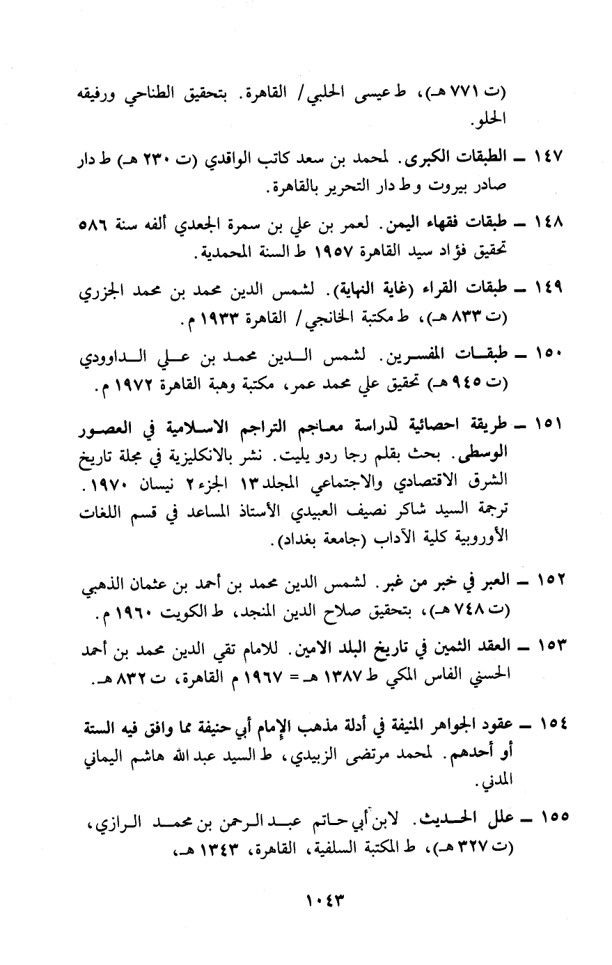 151- طريقة إحصائية لدراسة معاجم التراجم الإسلامية في العصور الوسطى. بحث بقلم رجا ردو يليت. نشر بالإنكليزية في مجلة تاريخ الشرق الاقتصادي والاجتماعي المجلد 13 الجزء2 نيسان 1970. ترجمة السيد شاكر نصيف العبيدي الأستاذ المساعد في قسم اللغات الأوروبية كلية الآداب (جامعة بغداد) .