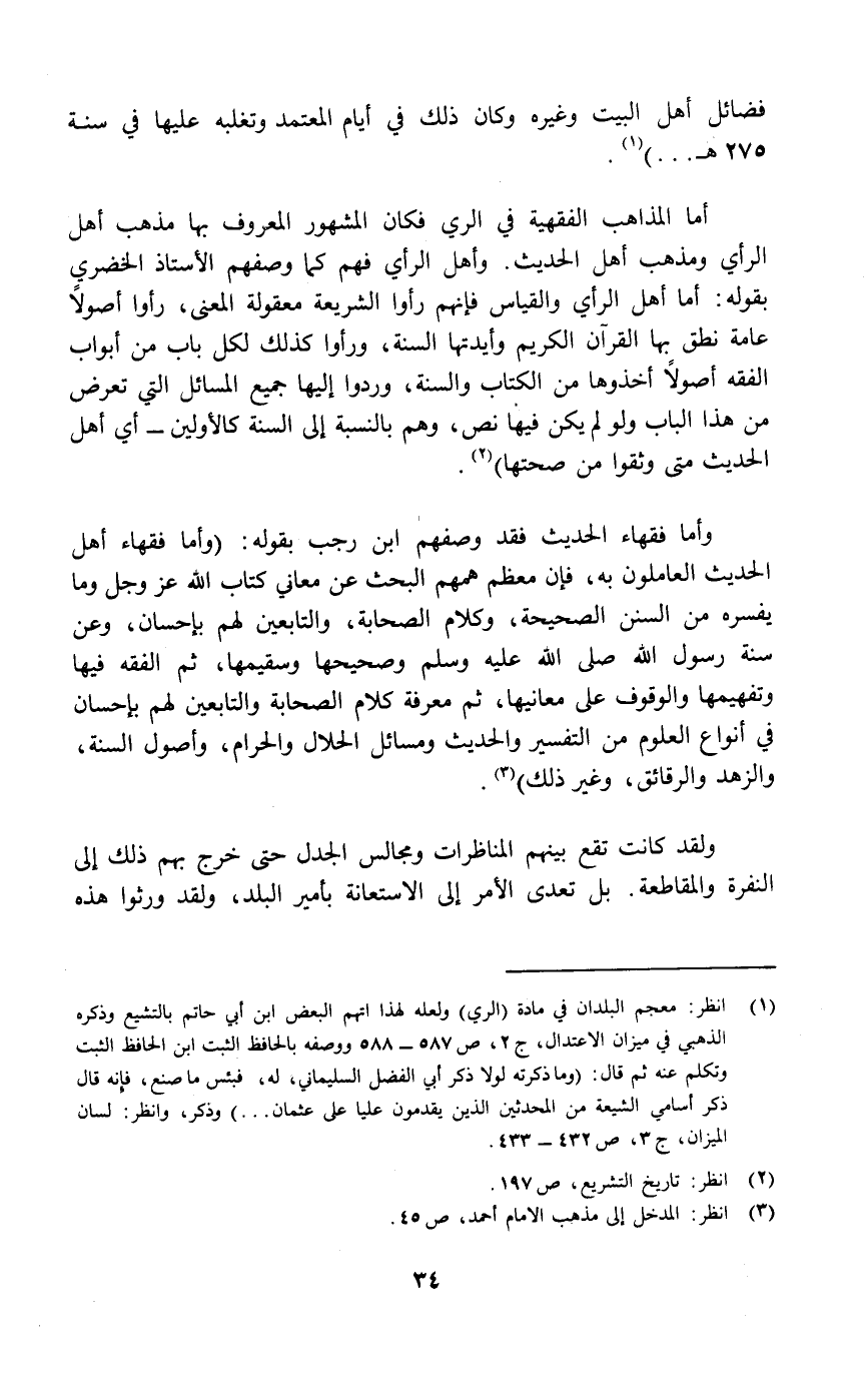 أما المذاهب الفقهية في الري فكان المشهور المعروف بها مذهب أهل الرأي ومذهب أهل الحديث. وأهل الرأي فهم كما وصفهم الأستاذ الخضري بقوله: "أما أهل الرأي والقياس فإنهم رأوا الشريعة معقولة المعنى، رأوا أصولاً عامة نطق بها القرآن الكريم وأيدتها السنة، ورأوا كذلك لكل باب من أبواب الفقه أصولاً أخذوها من الكتاب والسنة، وردوا إليها جميع المسائل التي تعرض من هذا الباب ولو لم يكن فيها نص، وهم بالنسبة إلى السنة كالأولين- أي أهل الحديث متى وثقوا من صحتها" (¬2) .