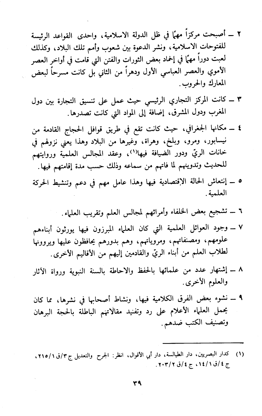 4- مكانها الجغرافي، حيث كانت تقع في طريق قوافل الحجاج القادمة من نيسابور، ومرو، وبلخ، وهراة، وغيرها من البلاد، وهذا يعني نزولهم في خانات الري ودور الضيافة فيها (¬1) ، وعقد المجالس العلمية وروايتهم للحديث وتدوينهم لما فاتهم من سماعه وذلك حسب مدة إقامتهم فيها.