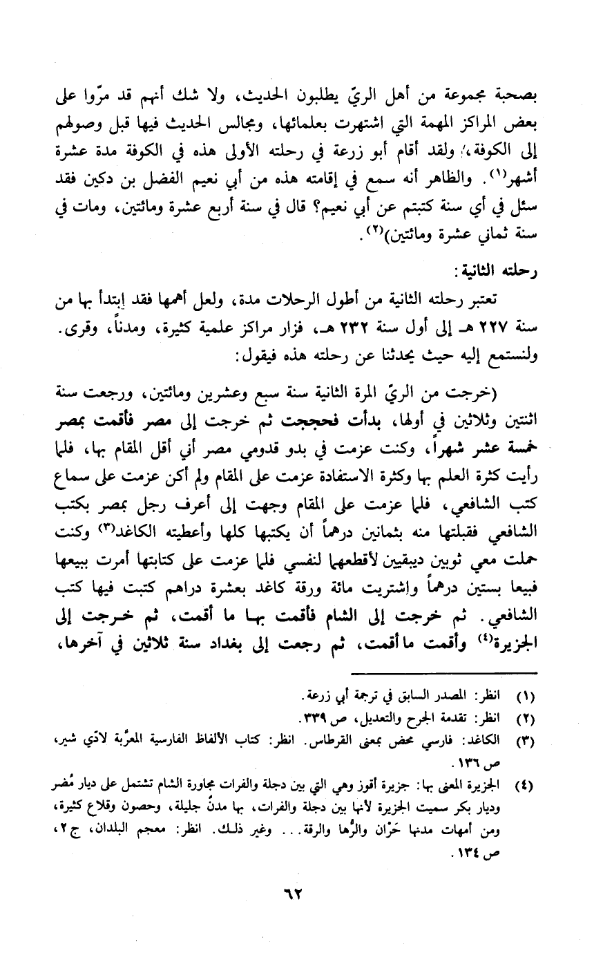 تعتبر رحلته الثانية من أطول الرحلات مدة، ولعل أهمها فقد ابتدأ بها من سنة 227 هـ إلى أول سنة 232 هـ، فزار مراكز علمية كثيرة، ومدناً، وقرى. ولنستمع إليه حيث يحدثنا عن رحلته هذه فيقول: "خرجت من الري المرة الثانية سنة سبع وعشرين ومائتين، ورجعت سنة اثنتين وثلاثين في أولها، بدأت فحججت ثم خرجت إلى مصر فأقمت بمصر خمسة عشر شهراً، وكنت عزمت في بدو قدومي مصر أني أقل المقام بها، فلما رأيت كئرة العلم بها وكثرة الاستفادة عزمت على المقام ولم أكن عزمت على سماع كتب الشافعي، فلما عزمت على المقام وجهت إلى أعرف رجل بمصر بكتب الشافعي فقبلتها منه بثمانين درهماً أن يكتبها كلها وأعطيته الكاغد (¬3) وكنت حملت معي ثوبين ديبقيين لأقطعهما لنفسي فلما عزمت على كتابتها أمرت ببيعها فبيعا بستين درهماً واشتريت مائة ورقة كاغد بعشرة دراهم كتبت فيها كتب الشافعي. ثم خرجت إلى الشام فأقمت بها ما أقمت، ثم خرجت إلى الجزيرة (¬4) وأقمت ما أقمت، ثم رجعت إلى بغداد سنة ثلاثين في آخرها،