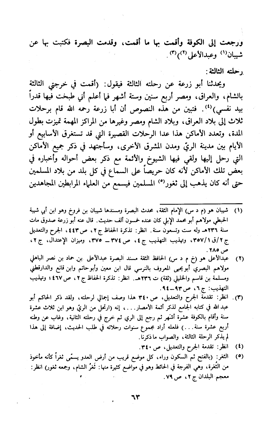 ويحدثنا أبو زرعة عن رحلته الثالثة فيقول: "أقمت في خرجتي الثالثة بالشام، والعراق، ومصر أربع سنين وستة أشهر فما أعلم أني طبخت فيها قدراً بيد نفسي" (¬4) . فتبين من هذه النصوص أن أبا زرعة رحمه الله قام برحلات ثلاث الى بلاد العراق، وبلاد الشام ومصر وغيرها من المراكز المهمة تميزت بطول المدة، وتعدد الأماكن هذا عدا الرحلات القصيرة التي قد تستغرق الأسابيع أو الأيام بين مدينة الري ومدن المشرق الأخرى، وسأجتهد في ذكر جميع الأماكن التي رحل إليها ولقي فيها الشيوخ والأئمة مع ذكر بعض أحواله وأخباره في بعض تلك الأماكن لأنه كان حريصاً على السماع في كل بلد من بلاد المسلمين حتى إنه كان يذهب إلى ثغور (¬5) المسلمين فيسمع من العلماء المرابطين المجاهدين