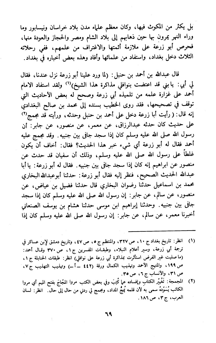(¬1) انظر: تاريخ بغداد ج 10 ص 327، والمنتظم ج 5 ص 47، وتاريخ دمشق لابن عساكر في ترجمة أبي زرعة، وسير أعلام النبلاء، وطبقات المفسرين ج 1 ص370 وقال أحمد: "ما صليت غير الفرض استأثرت بمذاكرة أبي زرعة على نوافلي" انظر: طبقات الحنابلة ج1 ص 199، والمنهج الأحمد وتهذيب الكمال ورقة (442- أ-) وتهذيب التهذيب ج 7 ص 31، والأنساب ج 6 ص 35.