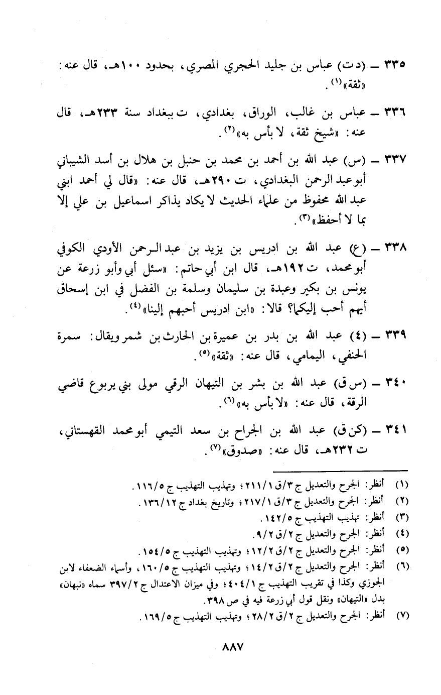 338- (ع) عبد الله بن إدريس بن يزيد بن عبد الرحمن الأودي الكوفي، أبو محمد، ت192 هـ، قَال ابن أبي حاتم: "سئل أبي وأبو زرعة عن يونس بن بكير وعبده بن سليمان وسلمة بن الفضل في ابن إسحاق أيهم أحب إليكما؟ قَالا: "ابن إدريس أحبهم إلينا" (¬4) .