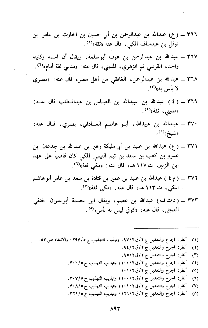 366- (ع) عبد الله بن عبد الرحمن بن أبي حسين بن الحارث بن عامر بن نوفل بن عبد مناف المكي، قَال عنه: "ثقة" (¬1) .