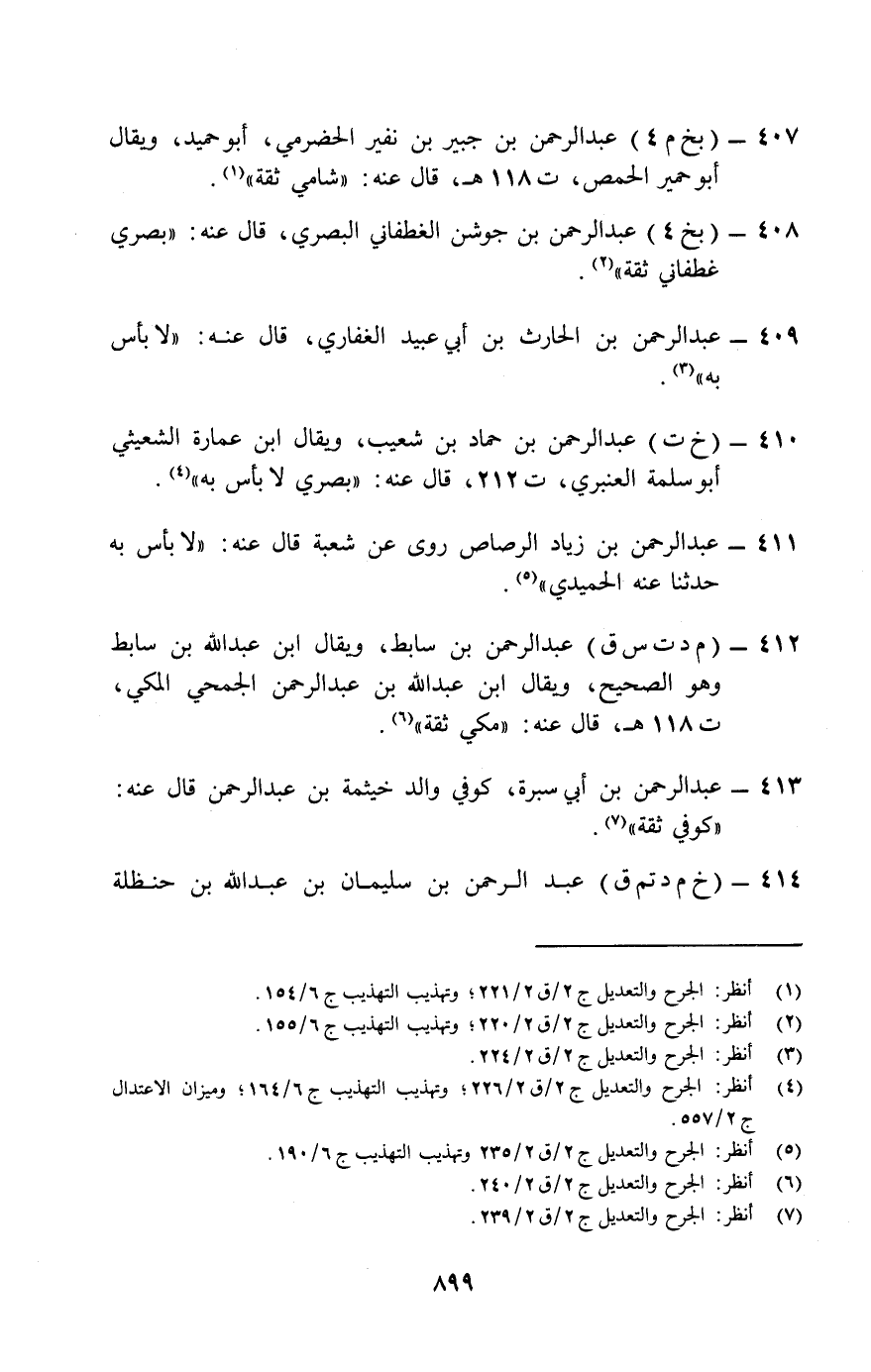 407- (بخ م4) عبد الرحمن بن جبير بن نفير الحضرمي، أبو حميد، ويقال أبو حمير الحمص، ت118هـ، قَال عنه: "شامي ثقة" (¬1) .