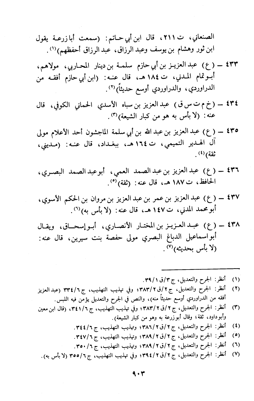 435- (ع) عبد العزيز بن عبد الله بن أبي سلمة الماجشون أحد الأعلام مولى آل الهدير التميمي، ت 164هـ، ببغداد، قَال عنه: "مديني، ثقة" (¬4) .