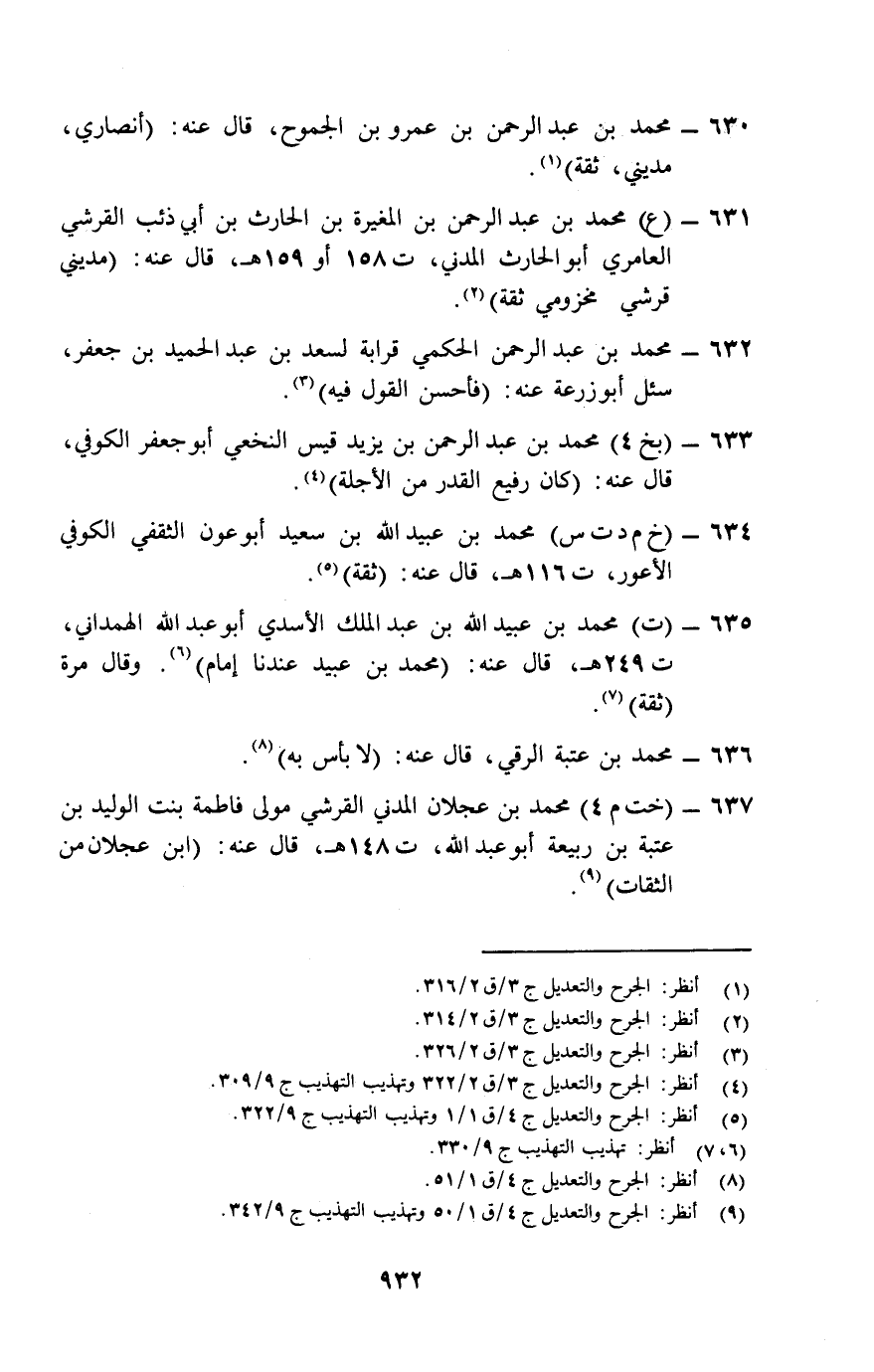 631- (ع) محمد بن عبد الرحمن بن المغيرة بن الحارث بن أبي ذئب القرشي العامري أبو الحارث المدني، ت 158 أو 159 هـ، قال عنه: "مديني قرشي مخزومي ثقة" (¬2) .