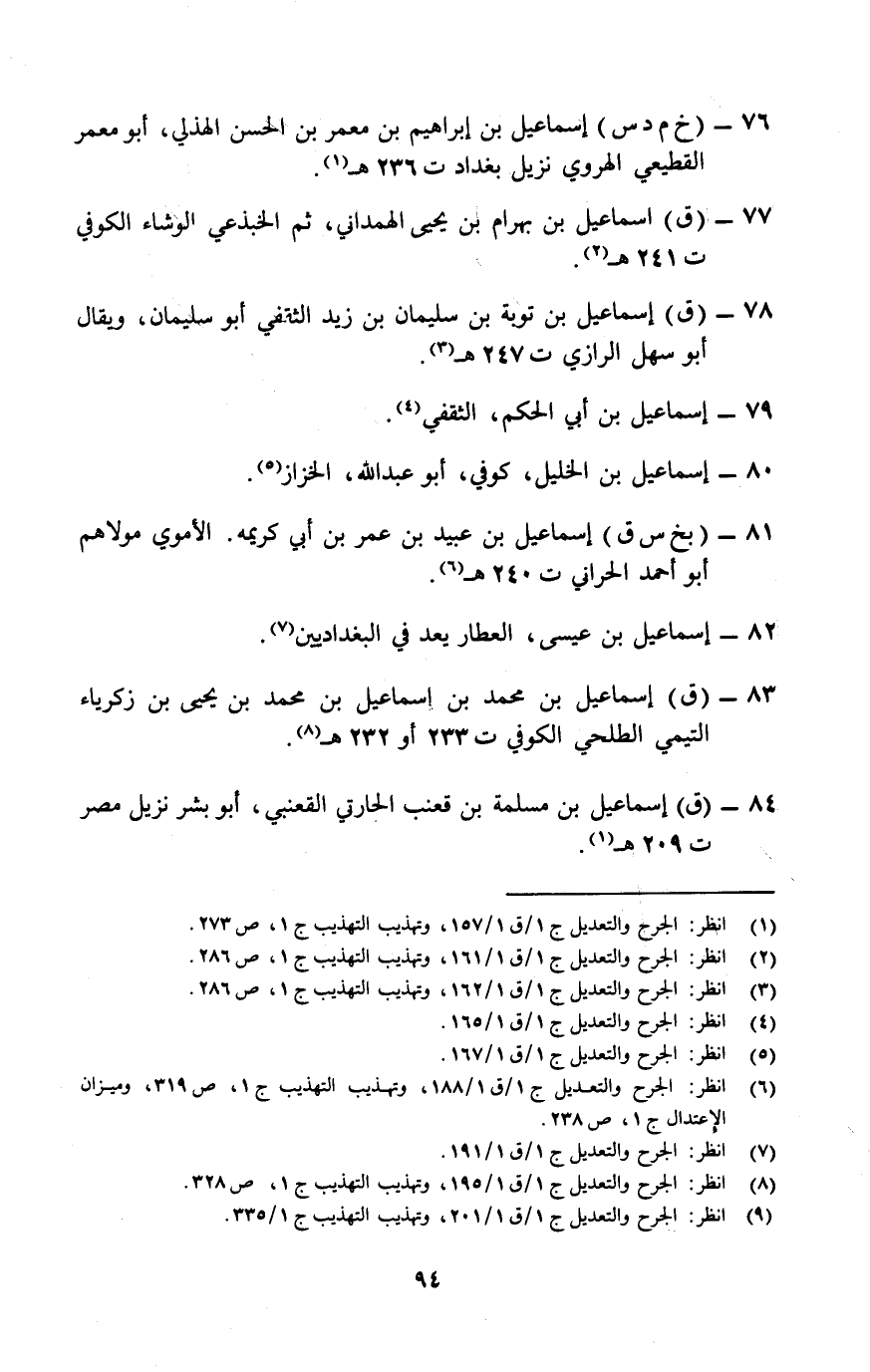 83- (ق) إسماعيل بن محمد بن إسماعيل بن محمد بن يحيى بن زكرياء التيمي الطلحي الكوفي ت 233 أو 232 هـ (¬8) .