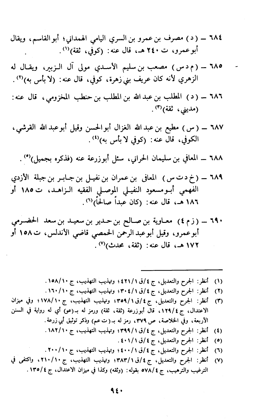 690- (زم 4) معاوية بن صالح بن حدير بن سعيد بن سعد الحضرمي أبو عمرو، وقيل أبو عبد الرحمن الحمصي قاضي الأندلس، ت 158 أو 172 هـ، قال عنه: "ثقة، محدث" (¬7) .