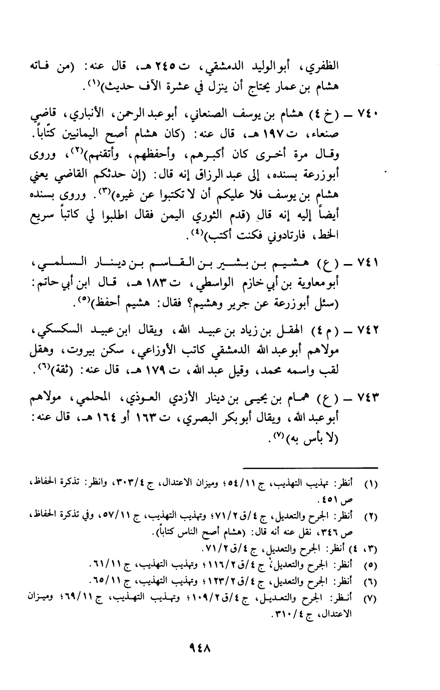 740- (خ 4) هشام بن يوسف الصنعاني، أبو عبد الرحمن، الأنباري، قاضي صنعاء، ت 197 هـ، قال عنه: "كان هشام أصح اليمانيين كتابا.