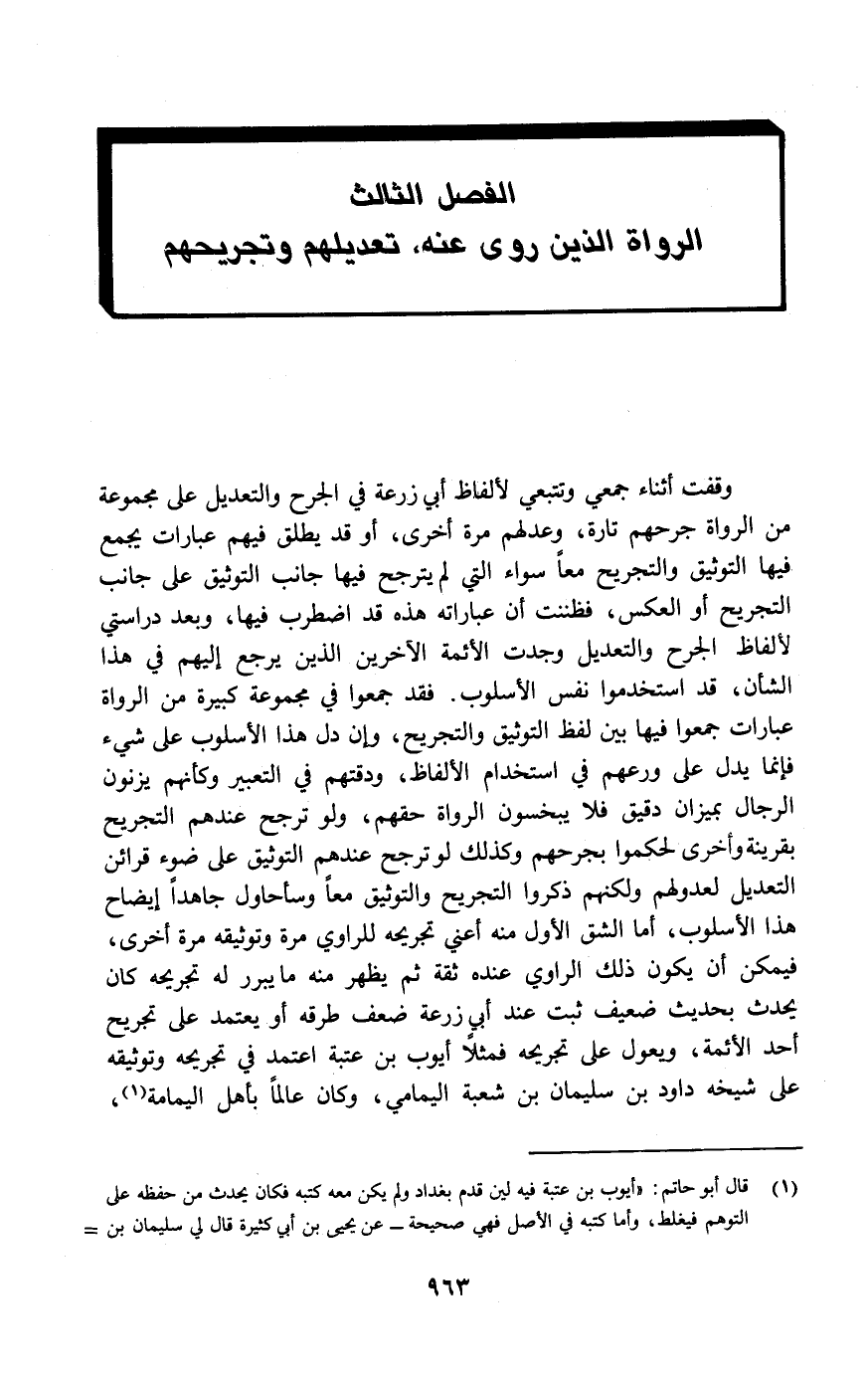 وقفت أثناء جمعي وتتبعي لألفاظ أبي زرعة في الجرح والتعديل على مجموعة من الرواة جرحهم تارة، وعدلهم مرة أخرى، أو قد يطلق فيهم عبارات يجمع فيها التوثيق والتجريح معاً سواء التي لم يترجح فيها جانب التوثيق على جانب التجريح أو العكس، فظننت أن عباراته هذه قد اضطرب فيها، وبعد دراستي لألفاظ الجرح والتعديل وجدت الأئمة الآخرين الذين يرجع إليهم في هذا الشأن، قد استخدموا نفس الأسلوب. فقد جمعوا في مجموعة كبيرة من الرواة عبارات جمعوا فيها بين لفظ التوثيق والتجريح، وإن دل هذا الأسلوب على شيء فإنما يدل على ورعهم في استخدام الألفاظ، ودقتهم في التعبير وكأنهم يزنون الرجال بميزان دقيق فلا يبخسون الرواة حقهم، ولو ترجح عندهم التجريح بقرينة وأخرى لحكموا بجرحهم وكذلك لو ترجح عندهم التوثيق على ضوء قرائن التعديل لعدولهم ولكنهم ذكروا التجريح والتوثيق معا وسأحاول جاهدا إيضاح هذا الأسلوب، أما الشق الأول منه أعني تجريحه للراوي مرة وتوثيقه مرة أخرى، فيمكن أن يكون ذلك الراوي عنده ثقة ثم يظهر منه ما يبرر له تجريحه كأن يحدث بحديث ضعيف ثبت عند أبي زرعة ضعف طرقه أو يعتمد على تجريح أحد الأئمة، ويعول على تجريحه فمثلا أيوب ابن عتبة اعتمد في تجريحه وتوثيقه على شيخه داود بن سليمان بن شعبة اليمامي، وكان عالما بأهل اليمامة (¬1) ،