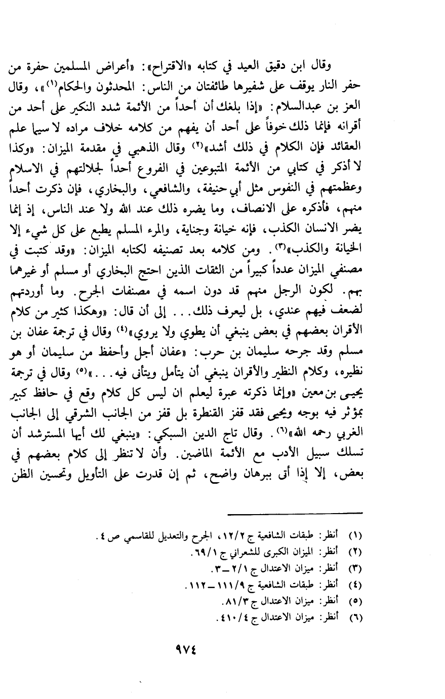 وقال ابن دقيق العيد في كتابه (الاقتراح) : "أعراض المسلمين حفرة من حفر النار يوقف على شفيرها طائفتان من الناس: المحدثون والحكام (¬1) "، وقال العز بن عبد السلام "إذا بلغك أن أحداً من الأئمة شدد النكير على أحد من أقرانه فإنما ذلك خوفاً على أحد أن يفهم من كلامه خلاف مراده لا سيما علم العقائد فإن الكلام في ذلك أشد (¬2) وقال الذهبي في مقدمة الميزان: "وكذا لا أذكر في كتابي من الأئمة المتبوعين في الفروع أحداً لجلالتهم في الإسلام وعظمتهم في النفوس مثل أبي حنيفة، والشافعي، والبخاري، فإن ذكرت أحدا منهم، فأذكره على الإنصاف، وما يضره ذلك عند الله ولا عند الناس، إذ إنما يضر الإنسان الكذب، فإنه خيانة وجناية، والمرء المسلم يطبع على كل شيء إلا الخيانة والكذب" (¬3) . ومن كلامه بعد تصنيفه لكتابه الميزان: "وقد كتبت في مصنفي الميزان عدداً كبيراً من الثقات الذين احتج البخاري أو مسلم أو غيرهما بهم. لكون الرجل منهم قد دون اسمه في مصنفات الجرح. وما أوردتهم لضعف فيهم عندي، بل ليعرف ذلك ... " إلى أن قال: "أو هكذا كثير من كلام الأقران بعضهم في بعض ينبغي أن يطوى ولا يروى" (¬4) وقال في ترجمة عفان بن مسلم وقد جرحه سليمان بن حرب: " عفان أجل وأحفظ من سليمان أو هو نظيره، وكلام النظير والأقران ينبغي أن يتأمل ويتأنى فيه ... " (¬5) وقال في ترجمة يحيى بن معين "وإنما ذكرته عبرة ليعلم أن ليس كل كلام وقع في حافظ كبير بمؤثر فيه بوجه ويحيى فقد قفز القنطرة بل قفز من الجانب الشرقي إلى الجانب الغربي رحمه الله" (¬6) . وقال تاج الدين السبكي: "ينبغي لك أيها المسترشد أن تسلك سبيل الأدب مع الأئمة الماضين. وأن لا تنظر إلى كلام بعضهم في بعض، إلا إذا أتى ببرهان واضح، ثم إن قدرت على التأويل وتحسين الظن