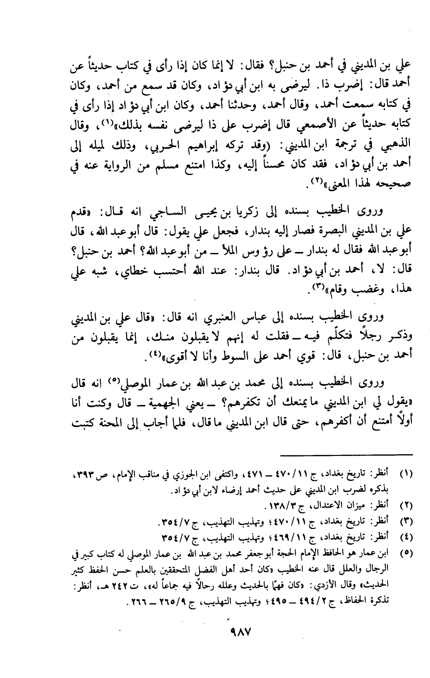 (¬1) انظر: تاريخ بغداد ج1 1/470-471، واكتفى ابن الجوزي في مناقب الإمام ص 393، بذكره لضرب ابن المديني على حديث أحمد إرضاء لابن أبي دؤاد.