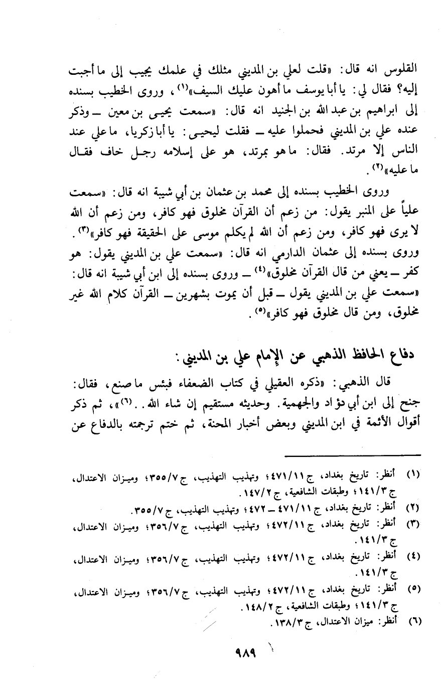 وروى الخطيب بسنده إلى محمد بن عثمان بن أبي شيبة أنه قال: "سمعت عليا على المنبر يقول: من زعم أن القرآن مخلوق فهو كافر، ومن زعم أن الله لا يرى فهو كافر، ومن زعم أن الله لم يكلم موسى على الحقيقة فهو كافر" (¬3) . وروى بسنده إلى عثمان الدارمي أنه قال: "سمعت علي بن المديني يقول: هو كفر - يعني من قال القرآن مخلوق" (¬4) - وروى بسنده إلى ابن أبي شيبة أنه قال: "سمعت علي بن المديني يقول- قبل أن يموت بشهرين- القرآن كلام الله غير مخلوق، ومن قال مخلوق فهو كافر" (¬5) .