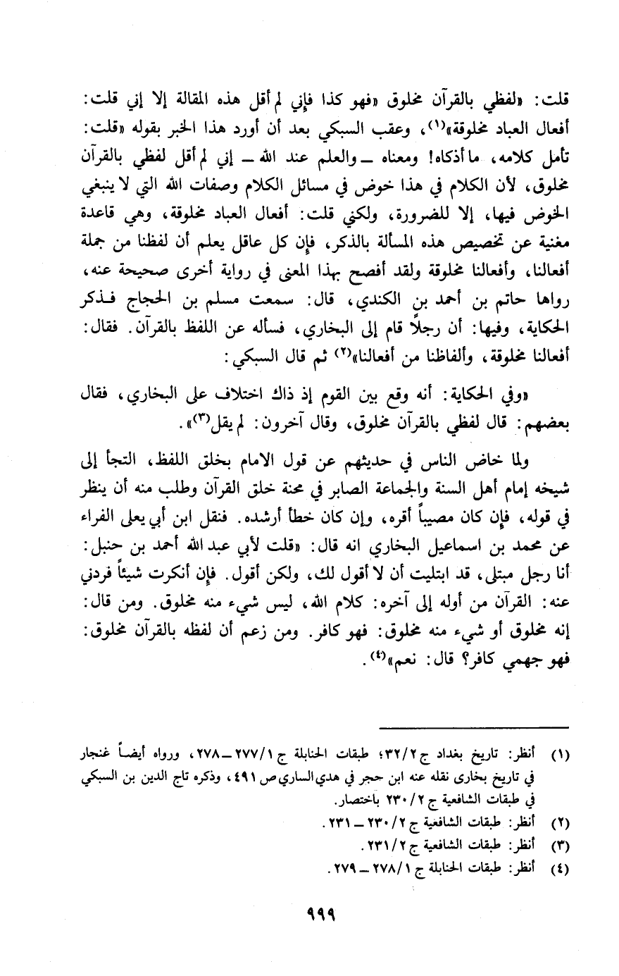 قلت: "لفظي بالقرآن مخلوق، فهو كذا فإني لم أقل هذه المقالة إلا إني قلت: أفعال العباد مخلوقة" (¬1) ، وعقب السبكي بعد أن أورد هذا الخبر بقوله "قلت: تأمل كلامه، ما أذكاه! ومعناه- والعلم عند الله- إني لم أقل لفظي بالقرآن مخلوق، لأن الكلام في هذا خوض في مسائل الكلام وصفات الله التي لا ينبغي الخوض فيها، إلا للضرورة، ولكني قلت: أفعال العباد مخلوقة، وهي قاعدة مغنية عن تخصيص هذه المسألة بالذكر، فإن كل عاقل يعلم أن لفظنا من جملة أفعالنا، وأفعالنا مخلوقة ولقد أفصح بهذا المعنى في رواية أخرى صحيحة عنه، رواها حاتم ابن أحمد بن الكندي، قال: سمعت مسلم بن الحجاج فذكر الحكاية، وفيها: أن رجلاً قام الى البخاري، فسأله عن اللفظ بالقرآن. فقال: أفعالنا مخلوقة، وألفاظنا من أفعالنا" (¬2) ثم قال السبكي: "وفي الحكاية: أنه وقع بين القوم إذ ذاك اختلاف على البخاري، فقال بعضهم: قال لفظي بالقرآن مخلوق، وقال آخرون: لم يقل" (¬3) .