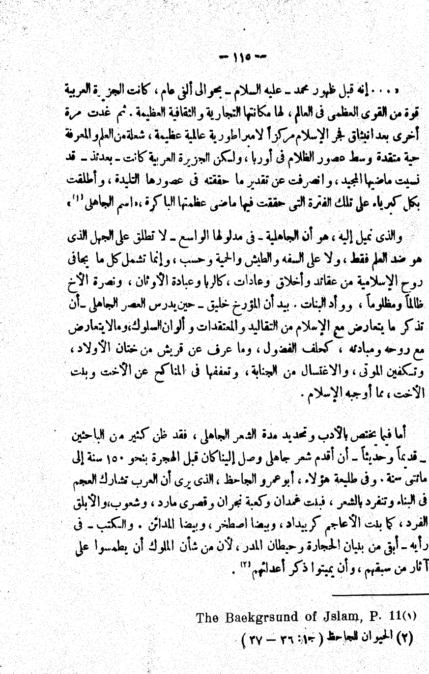 " ... إنه قبل ظهور محمد -عليه السلام- بحوالي ألفي عام، كانت الجزيرة العربية قوة من القوى العظمى في العالم, لها مكانتها التجارية والثقافية العظيمة. ثم غدت مرة أخرى بعد انبثاق فجر الإسلام مركزا لإمبراطورية عالمية عظيمة، شعلة من العلم والمعرفة حية متقدة وسط عصور الظلام في أوروبا، ولكن الجزيرة العربية كانت -بعدئذٍ- قد نسيت ماضيها المجيد، وانصرفت عن تقدير ما حققته في عصورها التليدة، وأطلقت بكل كبرياء على تلك الفترة التي حققت فيها ماضي عظمتها الباكرة "اسم الجاهلي""1.
