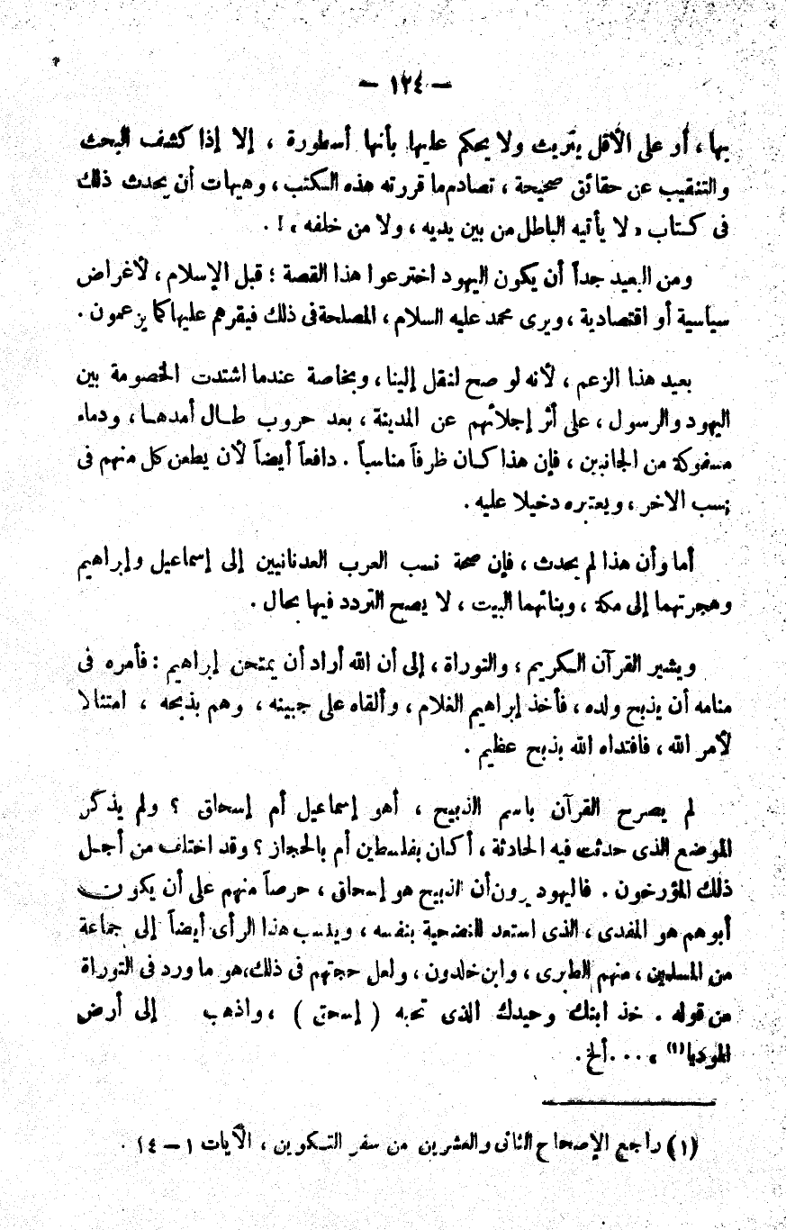 لم يصرح القرآن باسم الذبيح، أهو إسماعيل أم إسحاق؟ ولم يذكر الموضع الذي حدثت فيه الحادثة، أكان بفلسطين أم بالحجاز؟ وقد اختلف من أجل ذلك المؤرخون. فاليهود يرون أن الذبيح هو إسحاق؛ حرصا منهم على أن يكون أبوهم هو المفدى، الذي استعد للتضحية بنفسه، وينسب هذا الرأي أيضا إلى جماعة من المسلمين، منهم الطبري وابن خلدون، ولعل حجتهم في ذلك هو ما ورد في التوراة من قوله: "خذ ابنك وحيدك الذي تحبه "إسحاق"، واذهب إلى أرض الموديا1 ... إلخ".