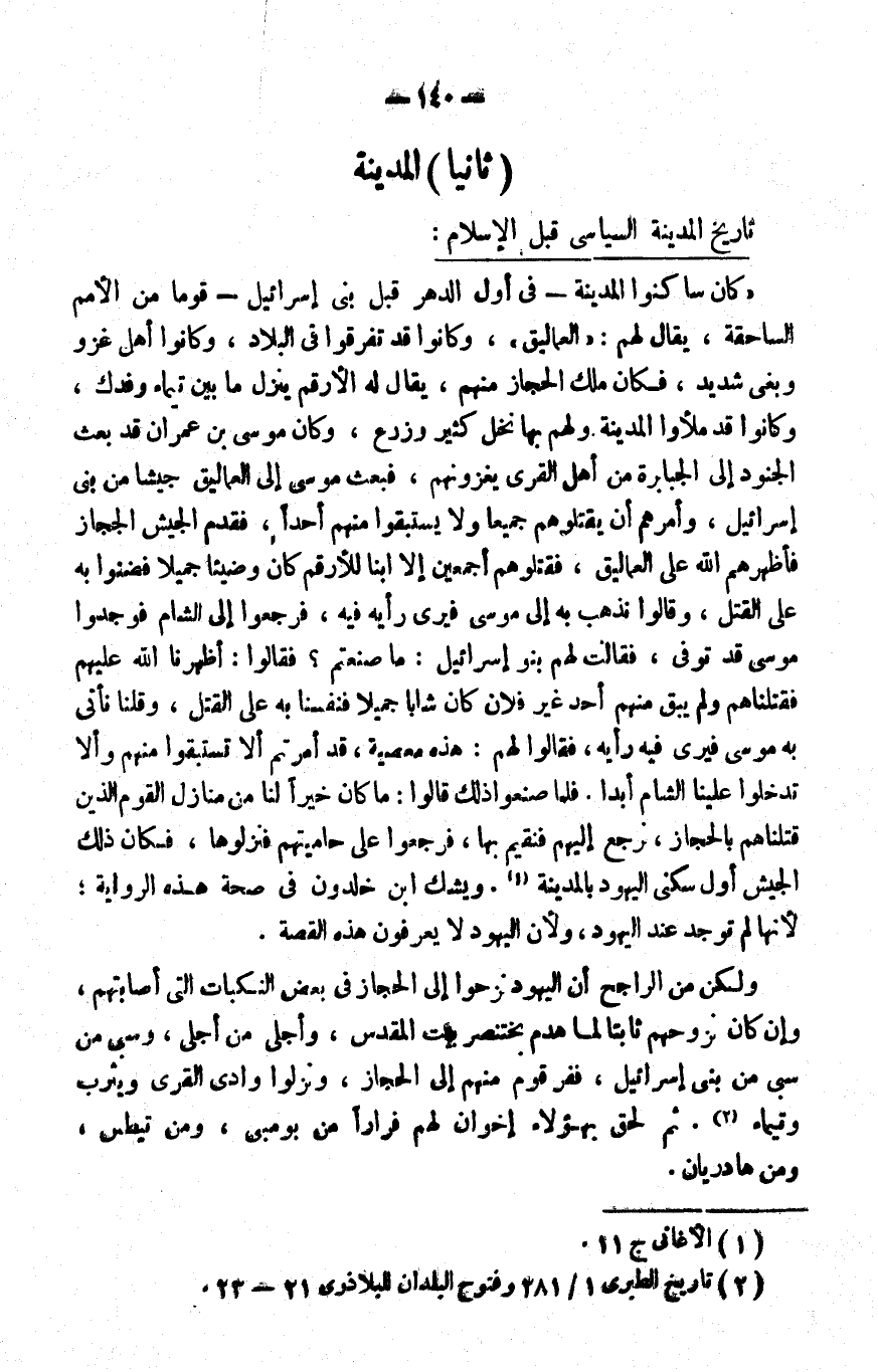 "كان ساكنو المدينة -في أول الدهر قبل بني إسرائيل- قوما من الأمم الساحقة، يقال لهم: "العماليق". وكانوا قد تفرقوا في البلاد، وكانوا أهل غزو وبغي شديد، فكان ملك الحجاز منهم يقال له: الأرقم, ينزل ما بين تيماء وفدك، وكانوا قد ملئوا المدينة ولهم بها نخل كثير وزرع، وكان موسى بن عمران قد بعث الجنود إلى الجبابرة من أهل القرى يغزونهم، فبعث موسى إلى العماليق جيشا من بني إسرائيل، وأمرهم أن يقتلوهم جميعا ولا يستبقوا منهم أحدا، فقدم الجيش الحجاز فأظهرهم الله على العماليق، فقتلوهم أجمعين إلا ابنا للأرقم كان وضيئا جميلا, فضنوا به على القتل، وقالوا: نذهب به إلى موسى فيرى رأيه فيه، فرجعوا إلى الشام فوجدوا موسى قد توفي، فقال لهم بنو إسرائيل: ما صنعتم؟ فقالوا: أظهرنا الله عليهم فقتلناهم, ولم يبق منهم أحد غير فلان كان شابا جميلا, فنفسنا به على القتل، وقلنا: نأتي به موسى فيرى فيه رأيه، فقالوا لهم: هذه معصية، قد أمرتم ألا تستبقوا منهم وألا تدخلوا علينا الشام أبدا. فلما صنعوا ذلك قالوا: ما كان خيرا لنا من منازل القوم الذين قتلناهم بالحجاز، نرجع إليهم فنقيم بها، فرجعوا على حاميتهم فنزلوها، فكان ذلك الجيش أول سكنى اليهود بالمدينة1. ويشك ابن خلدون في صحة هذه الرواية؛ لأنها لم توجد عند اليهود، ولأن اليهود لا يعرفون هذه القصة.