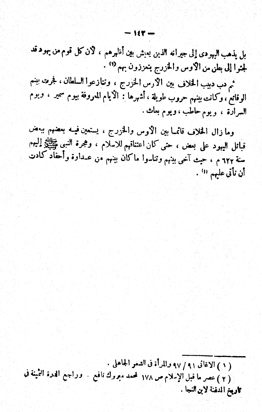 وما زال الخلاف قائما بين الأوس والخزرج، يستعين فيه بعضهم ببعض قبائل اليهود على بعض؛ حتى كان اعتناقهم للإسلام، وهجرة النبي -صلى الله عليه وسلم- إليهم سنة 622م، حيث آخى بينهم, وتناسوا ما كان بينهم من عداوة وأحقاد كادت أن تأتي عليهم2.