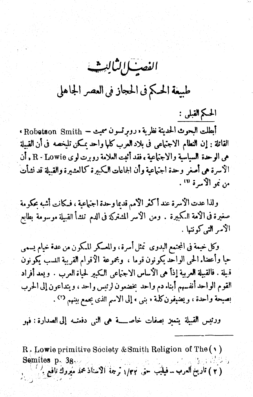أبطلت البحوث الحديثة نظرية "روبرتسون سميث Robetson Smith" القائلة: إن النظام الاجتماعي في بلاد العرب كلها واحد يمكن تلخيصه في أن القبيلة هي الوحدة السياسية والاجتماعية؛ فقد أثبت العلامة روبرت لوي R. Lowie "أن الأسرة هي أصغر وحدة اجتماعية, وأن الجماعات الكبيرة كالعشيرة والقبيلة قد نشأت من نمو الأسرة"1.