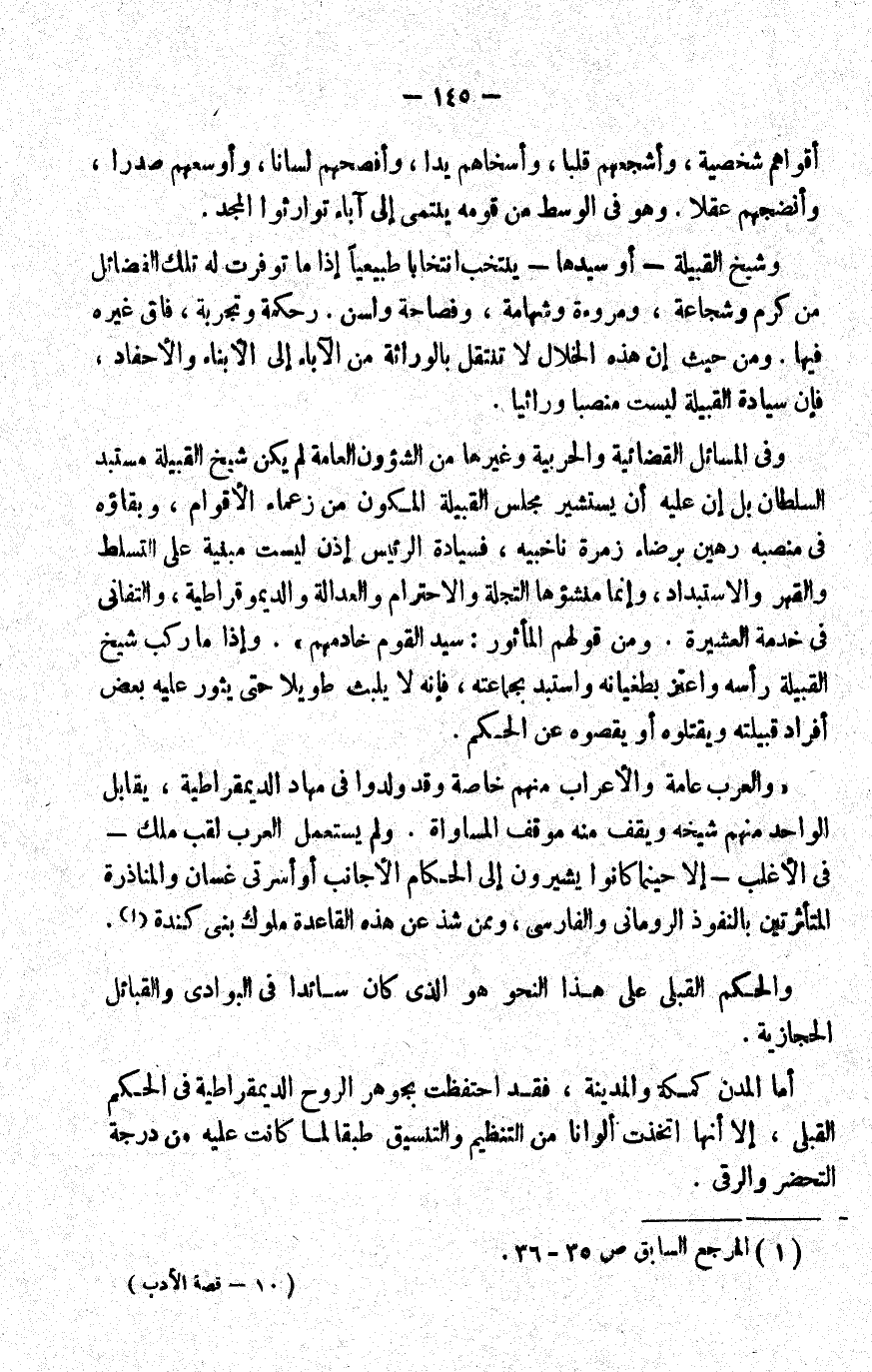 "والعرب عامة, والأعراب منهم خاصة وقد ولدوا في مهاد الديمقراطية، يقابل الواحد منهم شيخه ويقف منه موقف المساواة. ولم يستعمل العرب لقب ملك -في الأغلب- إلا حينما كانوا يشيرون إلى الحكام الأجانب أو أسرتي غسان والمناذرة المتأثرتين بالنفوذ الروماني والفارسي، ومن شذ عن هذه القاعدة ملوك بني كندة1.