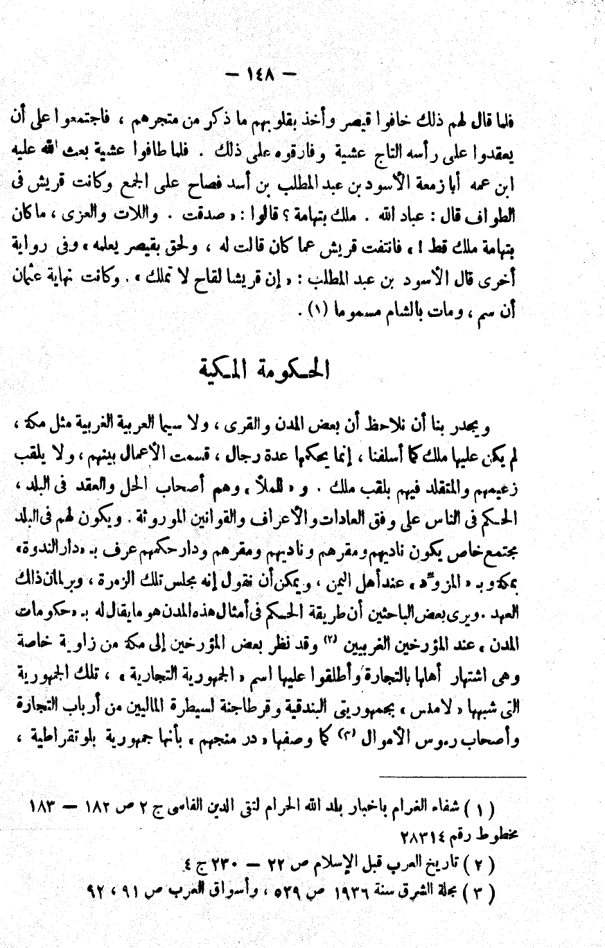 ويجدر بنا أن نلاحظ أن بعض المدن والقرى، ولا سيما العربية الغربية مثل مكة، لم يكن عليها ملك كما أسلفنا، إنما يحكمها عدة رجال, قسمت الأعمال بينهم، ولا يلقب زعيمهم والمتقلد فيهم بلقب ملك. و"للملأ" وهم أصحاب الحل والعقد في البلد، الحكم في الناس على وفق العادات والأعراف والقوانين الموروثة, ويكون لهم في البلد مجتمع خاص يكون ناديهم ومقرهم, وناديهم ومقرهم ودار حكمهم عرف بـ"دار الندوة" بمكة وبـ"المزوِّد" عند أهل اليمن. ويمكن أن نقول: إنه مجلس تلك الزمرة، وبرلمان ذلك العهد, ويرى بعض الباحثين أن طريقة الحكم في أمثال هذه المدن هو ما يقال له بـ"حكومات المدن" عند المؤرخين الغربيين2, وقد نظر بعض المؤرخين إلى مكة من زاوية خاصة وهي اشتهار أهلها بالتجارة وأطلقوا عليها اسم "الجمهورية التجارية"، تلك الجمهورية التي شبهها "لامنس" بجمهوريتي البندقية وقرطاجنة؛ لسيطرة الماليين من أرباب التجارة وأصحاب رءوس الأموال3 كما وصفها "در منجهم" بأنها جمهورية بلوتقراطية،