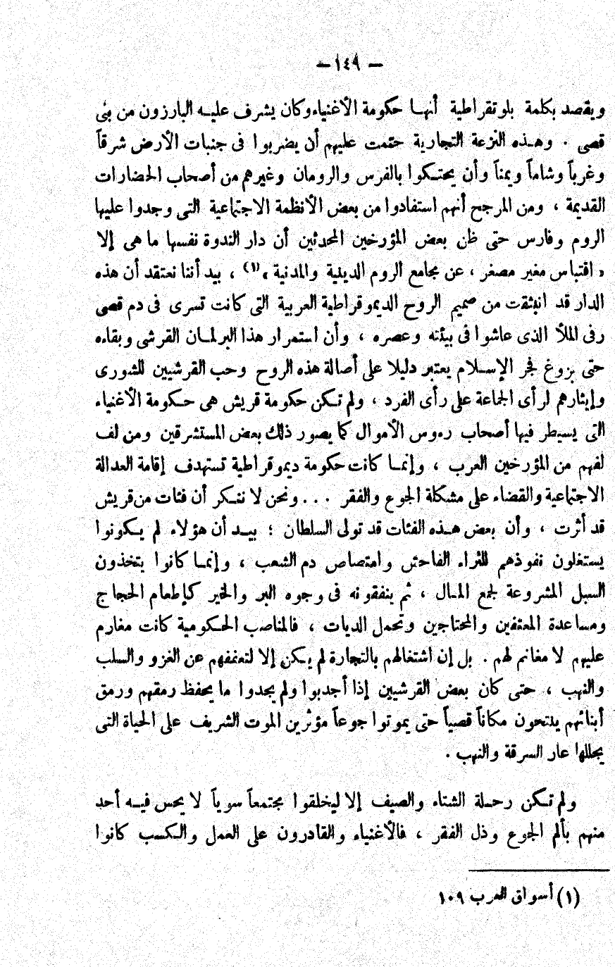 ويقصد بكلمة بلوتقراطية أنها حكومة الأغنياء, وكان يشرف عليه البارزون من بني قصي. وهذه النزعة التجارية حتّمت عليهم أن يضربوا في جنبات الأرض شرقا وغربا وشاما ويمنا, وأن يحتكوا بالفرس والرومان وغيرهم من أصحاب الحضارات القديمة. ومن المرجح أنهم استفادوا من بعض الأنظمة الاجتماعية التي وجدوا عليها الروم وفارس حتى ظن بعض المؤرخين المحدثين أن دار الندوة نفسها ما هي إلا "اقتباس مغير مصغر عن مجامع الروم الدينية والمدنية"1. بيد أننا نعتقد أن هذه الدار قد انبثقت من صميم الروح الديمقراطية العربية التي كانت تسري في دم قصي وفي الملأ الذين عاشوا في بيئته وعصره، وأن استمرار هذا البرلمان القرشي وبقاءه حتى بزوغ فجر الإسلام يعتبر دليلا على أصالة هذه الروح وحب القرشيين للشورى وإيثارهم لرأي الجماعة على رأي الفرد، ولم تكن حكومة قريش هي حكومة الأغنياء التي يسيطر فيها أصحاب رءوس الأموال كما يصور ذلك بعض المستشرقين ومن لف لفهم من المؤرخين العرب، وإنما كانت حكومة ديمقراطية تستهدف إقامة العدالة الاجتماعية والقضاء على مشكلة الجوع والفقر ... ونحن لا ننكر أن فئات من قريش قد أثرت، وأن بعض هذه الفئات قد تولى السلطان، بيد أن هؤلاء لم يكونوا يستغلون نفوذهم للثراء الفاحش وامتصاص دم الشعب، وإنما كانوا يتخذون السبل المشروعة لجمع المال، ثم ينفقونه في وجوه البر والخير كإطعام الحجاج ومساعدة المعتفين والمحتاجين وتحمل الديات، فالمناصب الحكومية كانت مغارم عليهم لا مغانم لهم. بل إن اشتغالهم بالتجارة لم يكن إلا لتعففهم عن الغزو والسلب والنهب، حتى كان بعض القرشيين إذا أجدبوا ولم يجدوا ما يحفظ رمقهم ورمق أبنائهم ينتحون مكانا قصيا حتى يموتوا جوعا, مؤثرين الموت الشريف على الحياة التي يجللها عار السرقة والنهب.