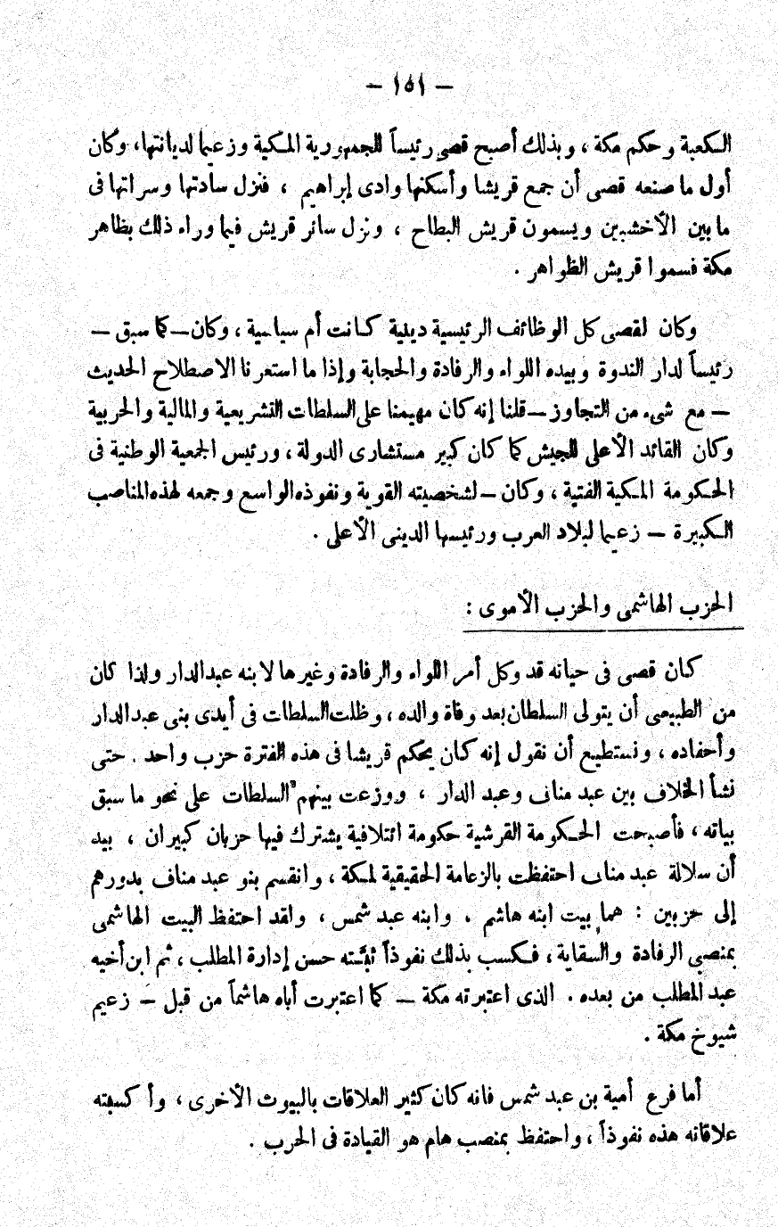 كان قصي في حياته قد وكل أمر اللواء والرفادة وغيرهما لابنه عبد الدار؛ ولذا كان من الطبيعي أن يتولى السلطان بعد وفاة والده، وظلت السلطات في أيدي بني عبد الدار وأحفاده. ونستطيع أن نقول: إنه كان يحكم قريشا في هذه الفترة حزب واحد, حتى نشأ الخلاف بين عبد مناف وعبد الدار، ووزعت بينهم السلطات على نحو ما سبق بيانه، فأصبحت الحكومة القرشية حكومة ائتلافية يشترك فيها حزبان كبيران. بيد أن سلالة عبد مناف احتفظت بالزعامة الحقيقية لمكة، وانقسم بنو عبد مناف بدورهم إلى حزبين هما: بيت ابنه هاشم، وابنه عبد شمس، ولقد احتفظ البيت الهاشمي بمنصبي الرفادة والسقاية، فكسب بذلك نفوذا ثبَّته حسن إدارة المطلب، ثم ابن أخيه عبد المطلب من بعده الذي اعتبرته مكة -كما اعتبرت أباه هاشما من قبل- زعيم شيوخ مكة.