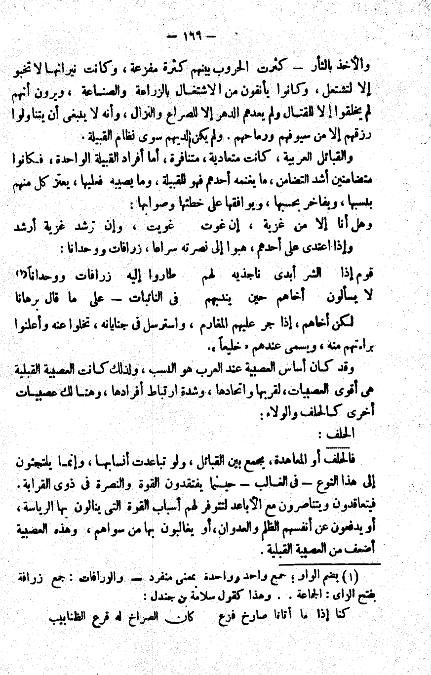 والأخذ بالثأر, كثرت الحروب بينهم كثرة مفزعة، وكانت نيرانها لا تخبو إلا لتشتعل، وكانوا يأنفون من الاشتغال بالزراعة والصناعة، ويرون أنهم لم يخلقوا إلا للقتال ولم يعدهم الدهر إلا للصراع والنزال، وأنه لا ينبغي أن يتناولوا رزقهم إلا من سيوفهم ورماحهم, ولم يكن لديهم سوى نظام القبيلة.