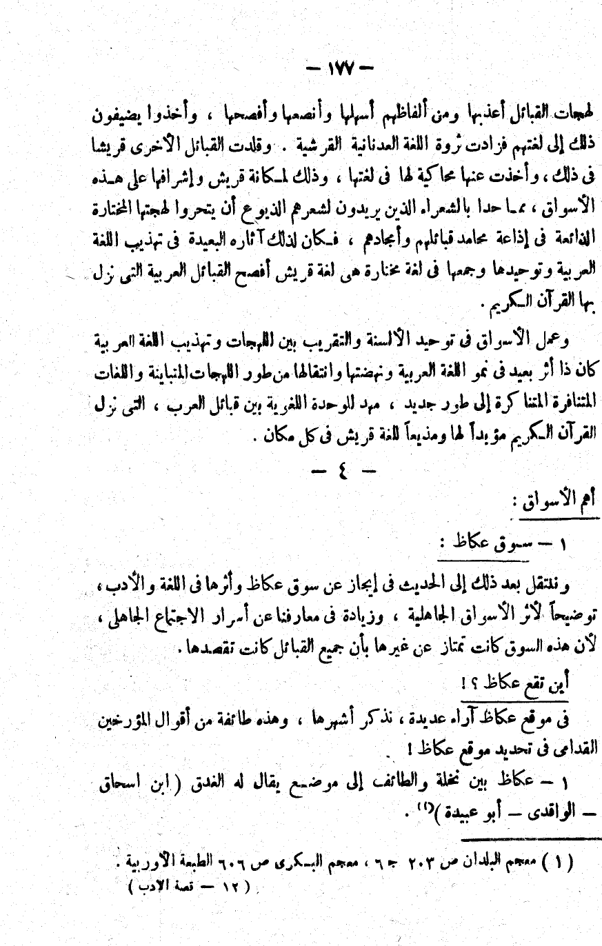 وننتقل بعد ذلك إلى الحديث في إيجاز عن سوق عكاظ وأثرها في اللغة والأدب؛ توضيحا لأثر الأسواق الجاهلية، وزيادة في معارفنا عن أسرار الاجتماع الجاهلي؛ لأن هذه السوق كانت تمتاز عن غيرها بأن جميع القبائل كانت تقصدها.