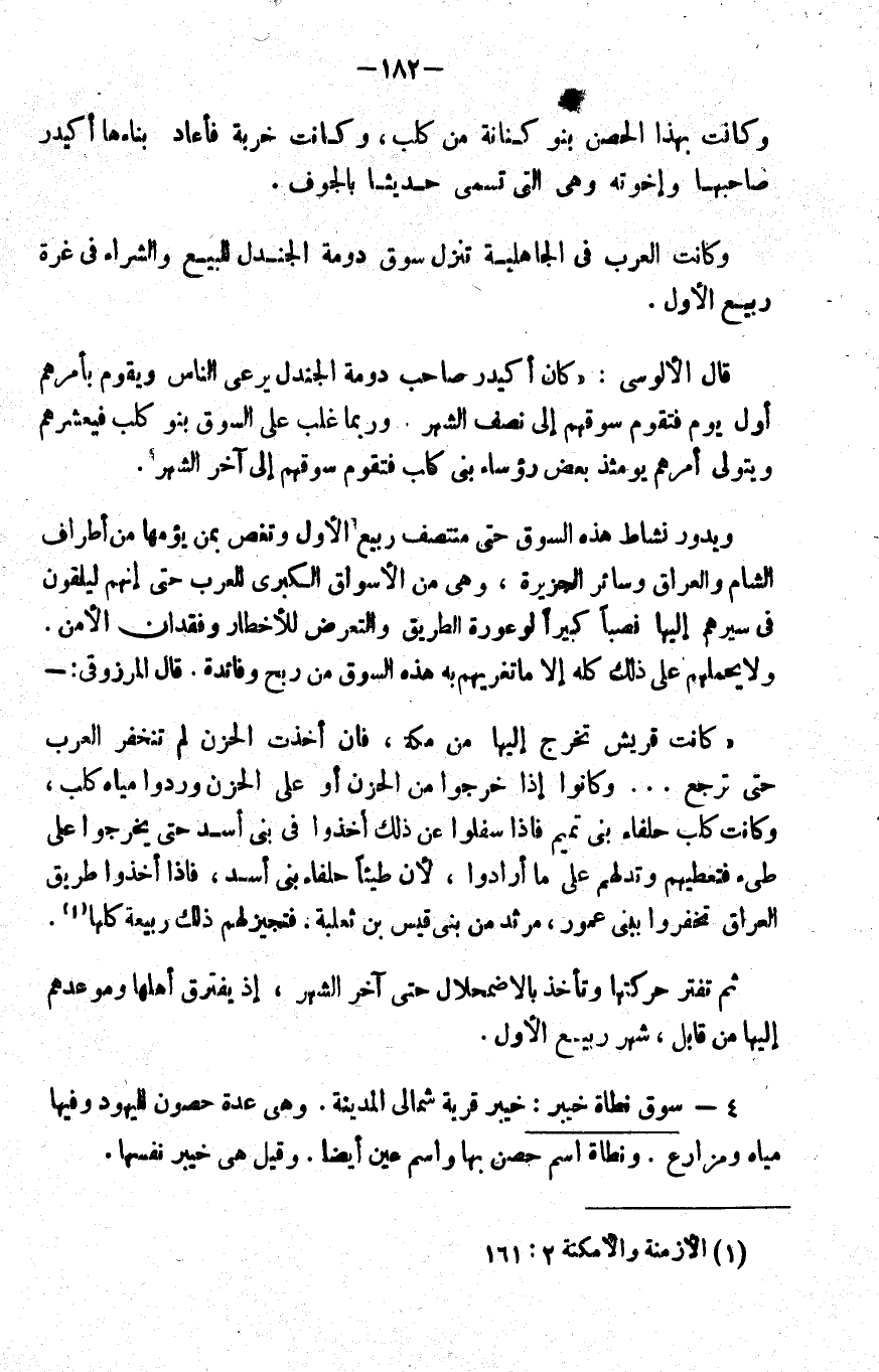 قال الألوسي: كان أكيدر صاحب دومة الجندل يرعى الناس ويقوم بأمرهم أول يوم, فتقوم سوقهم إلى نصف الشهر. وربما غلب على السوق بنو كلب فيعشرهم ويتولى أمرهم يومئذ بعض رؤساء بني كلب فتقوم سوقهم إلى آخر الشهر.