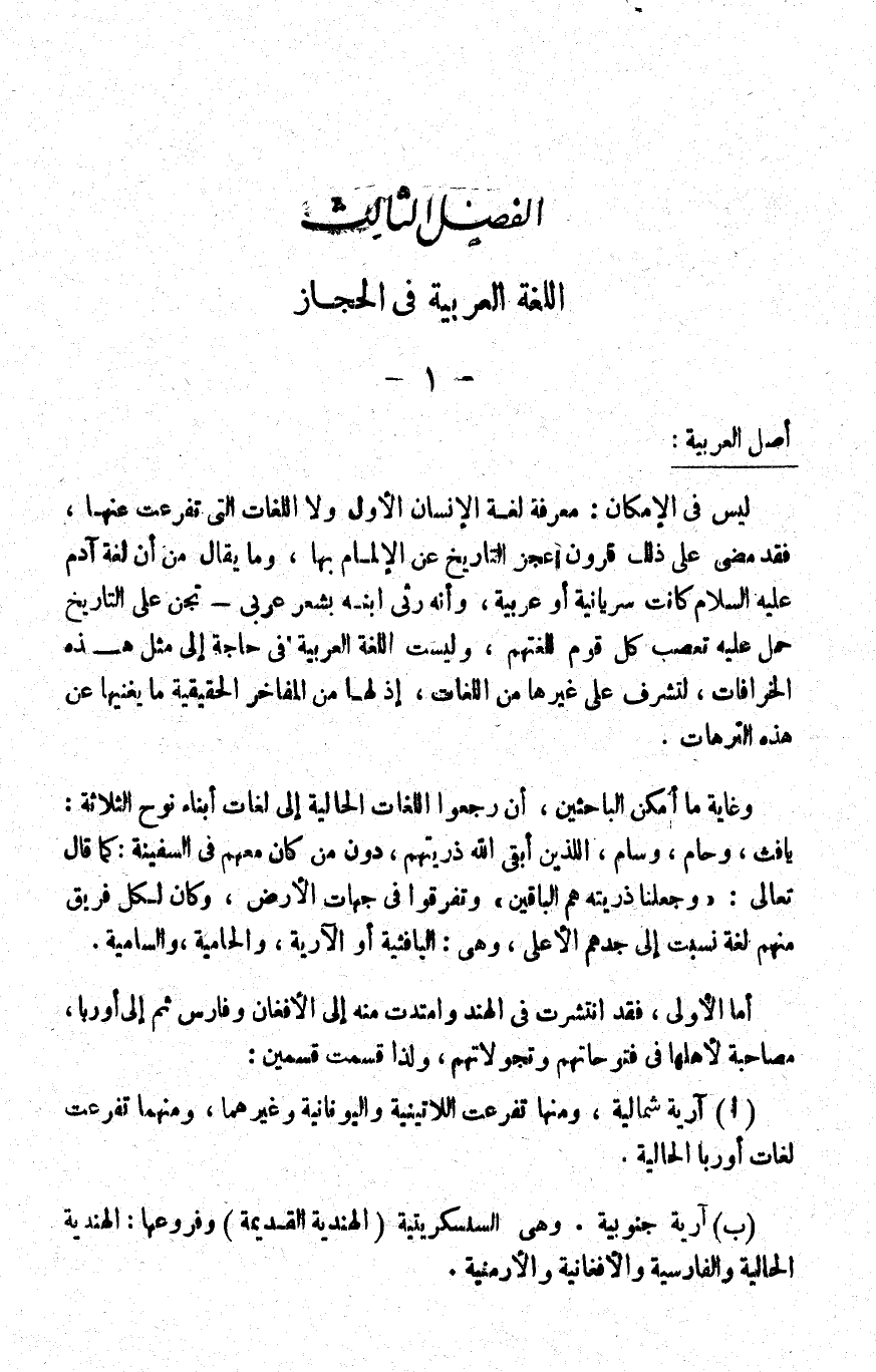 ليس في الإمكان معرفة لغة الإنسان الأول ولا اللغات التي تفرعت عنها، فقد مضى على ذلك قرون عجز التاريخ عن الإلمام بها، وما يقال من أن لغة آدم -عليه السلام- كانت سريانية أو عربية، وأنه رثى ابنه بشعر عربي, تَجَنٍّ على التاريخ حمل عليه تعصب كل قوم للغتهم، وليست اللغة العربية في حاجة إلى مثل هذه الخرافات لتشرف على غيرها من اللغات؛ إذ لها من المفاخر الحقيقية ما يغنيها عن هذه الترهات.